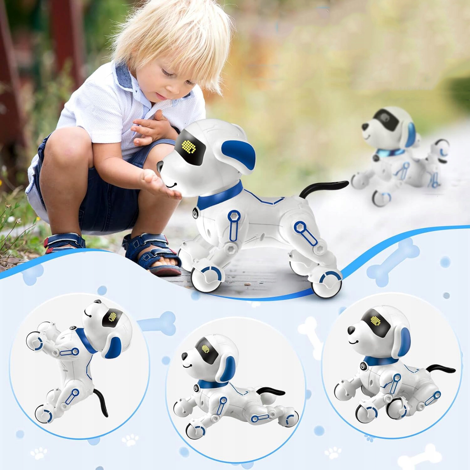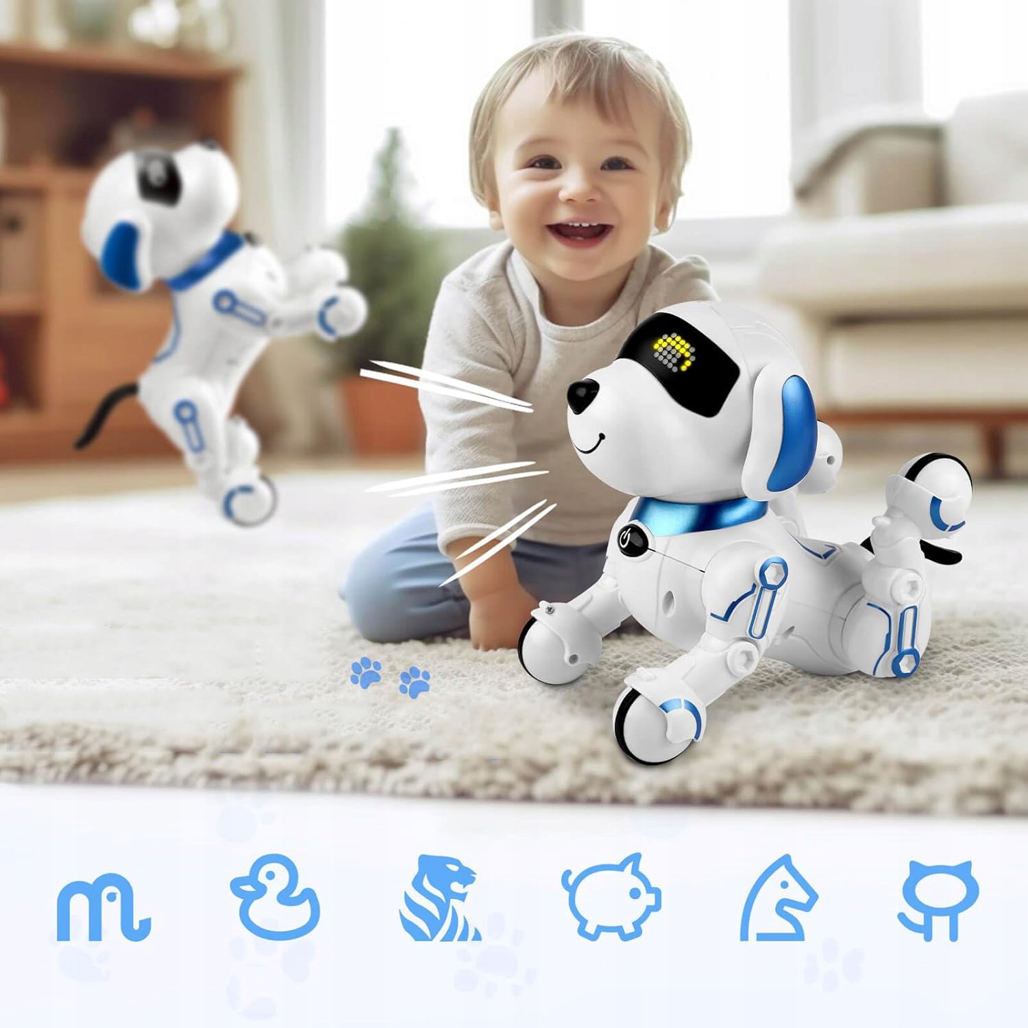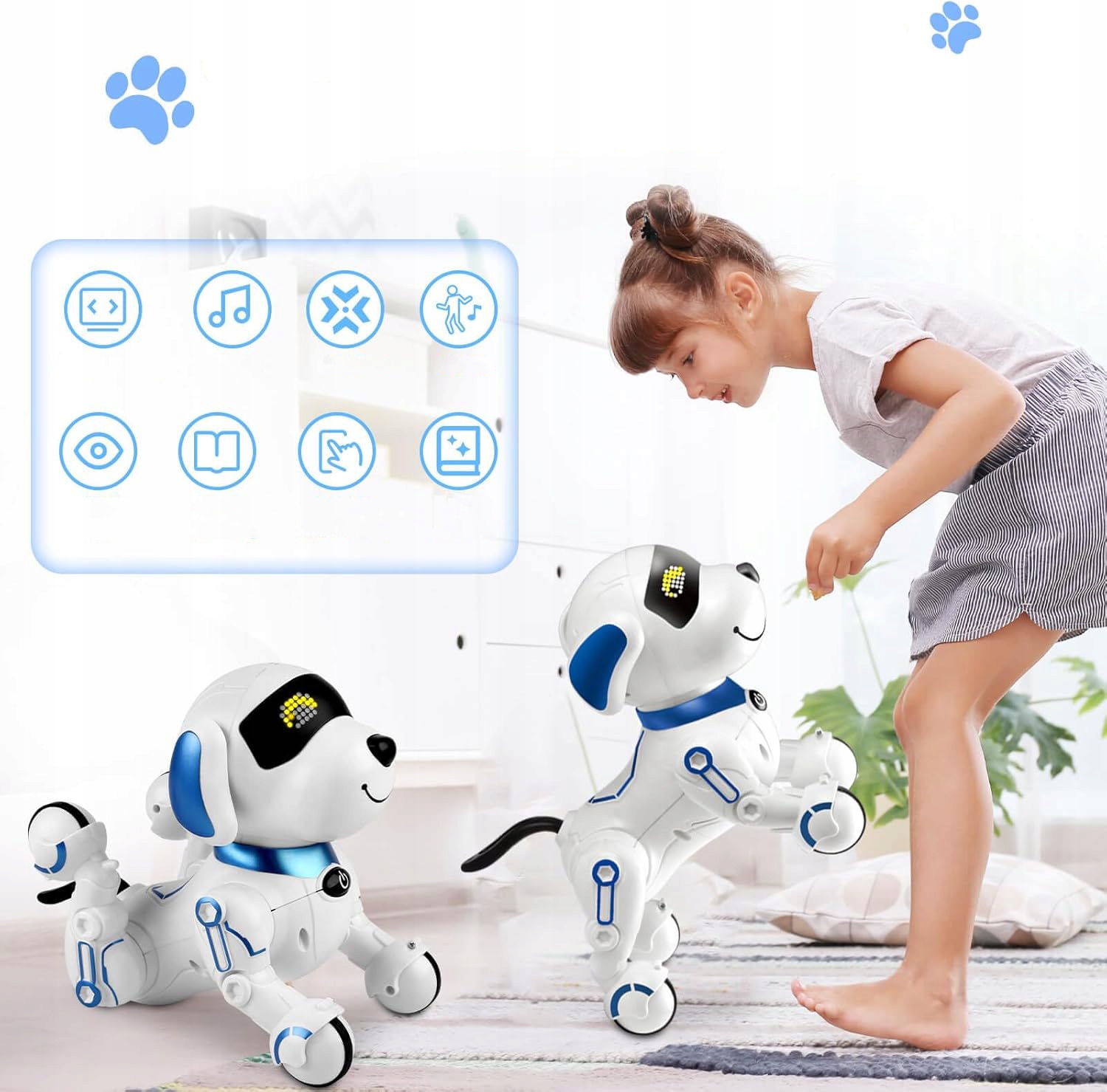 -Наш розумний собака-робот-це багатофункціональний супутник науки, який може розповідати історії, співати дитячі рими, танцювати, викладати англійську мову та наслідувати 6 різних звуків тварин, що надає дітям різні освітні та розважальні враження. Дитина може вільно запрограмувати собачку-робо, щоб здійснити низку заходів.