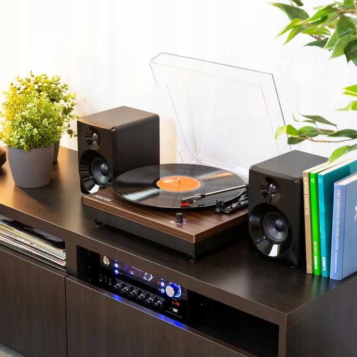 Fenton RP112D — це універсальна вертушка, завдяки якій ви можете не лише насолоджуватися своїми записами. Завдяки функції Bluetooth ви також можете передавати музику зі свого телефону чи планшета на вертушку. Плеєр підходить для всіх типів записів завдяки 3 швидкостям. Функція автоматичної зупинки запобігає непотрібному зносу голки. Вбудовані динаміки бездоганно відтворюють звук, тому ви можете насолоджуватися улюбленою музикою з RP112D.