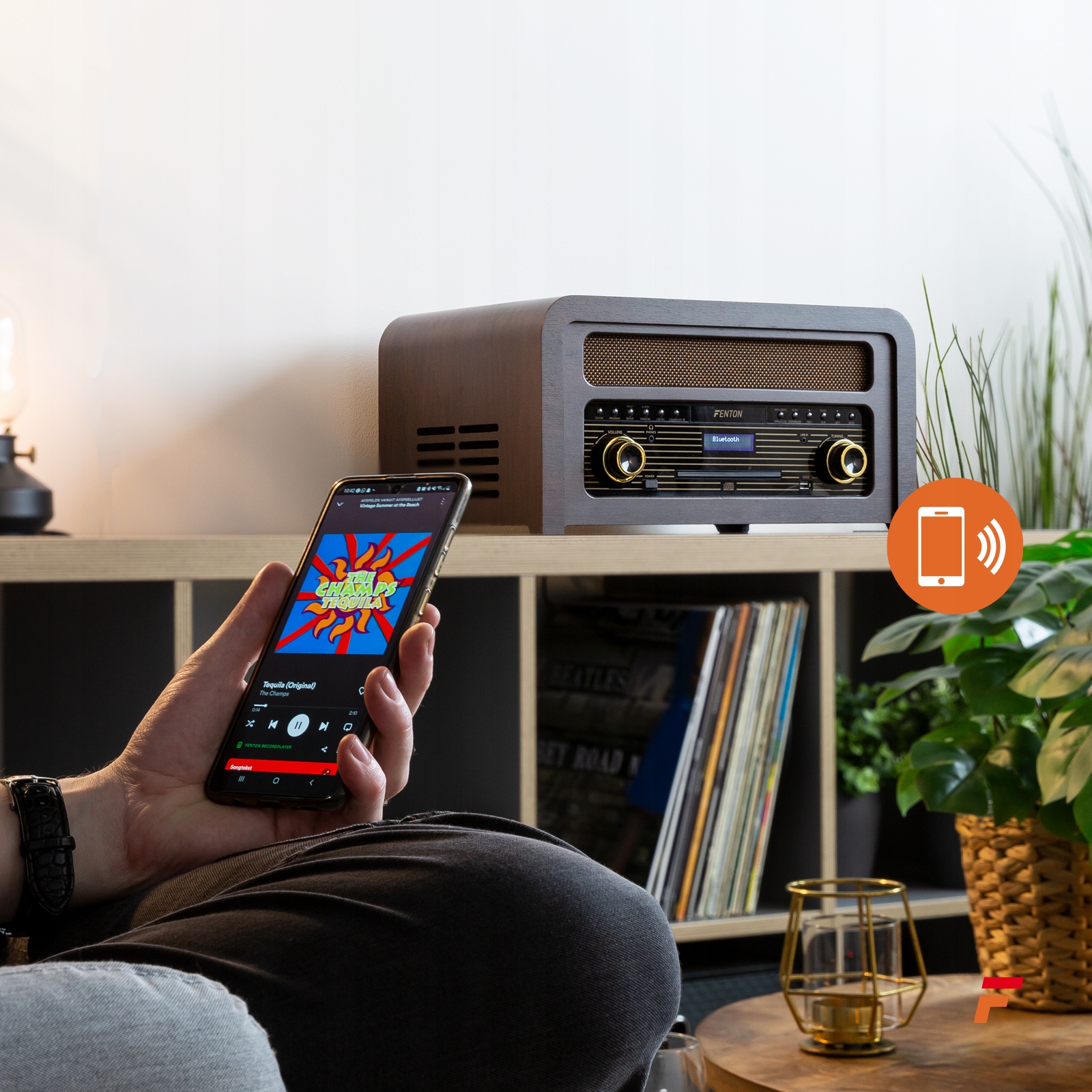 Під ретро-зображенням ви знайдете, серед іншого: Bluetooth. Підключіться до свого телефону, планшета тощо по бездротовій мережі, і музика, яка відтворюється на вашому сполученому пристрої, буде передаватись у Нешвіл по бездротовій мережі.