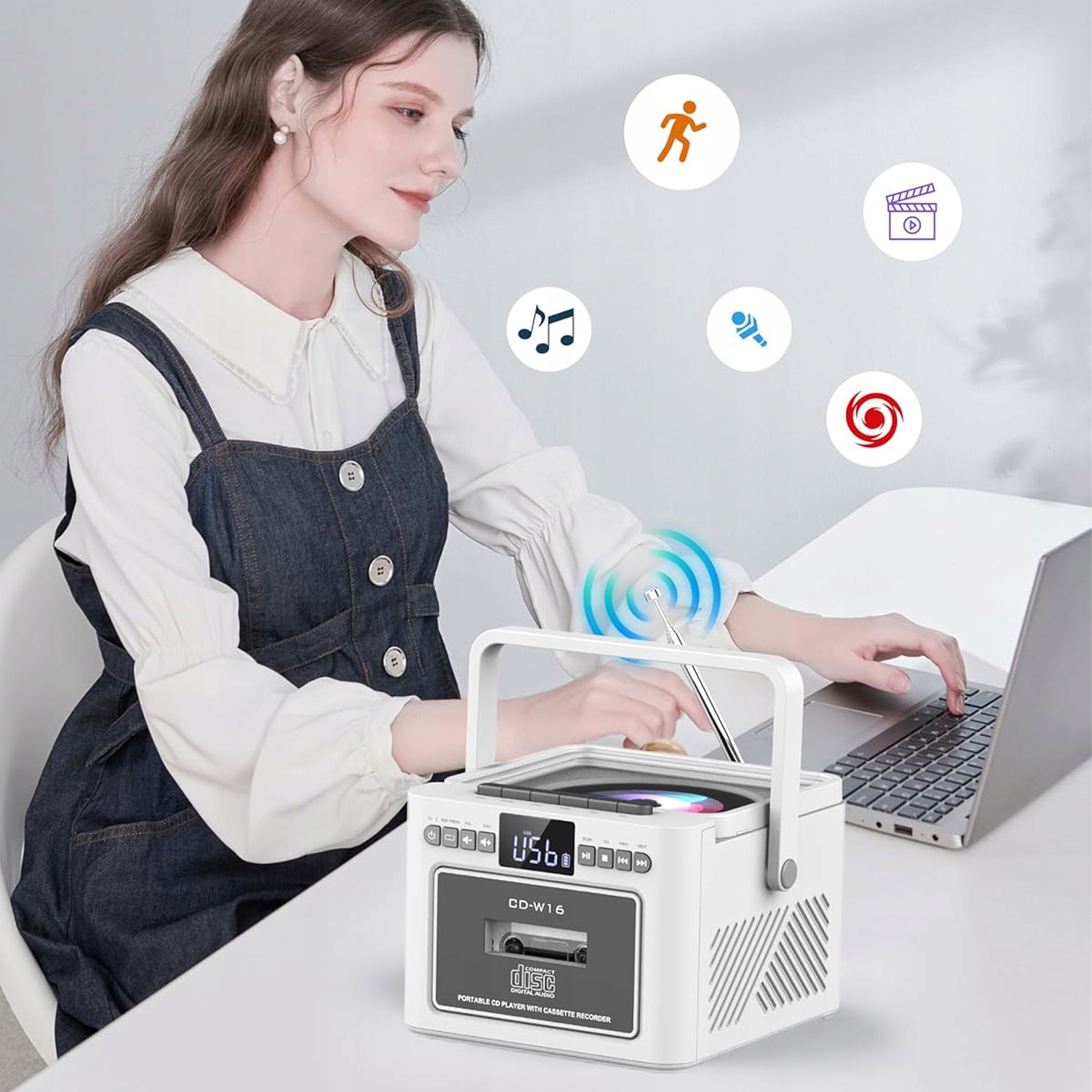 Цей портативний програвач компакт-дисків є ідеальним подарунком для родини та друзів. Це ідеальний музичний компаньйон на кухні, у спальні або під час активного відпочинку. Завдяки тонкому дизайну та різноманітним функціям це продуманий і практичний вибір для подарунка.