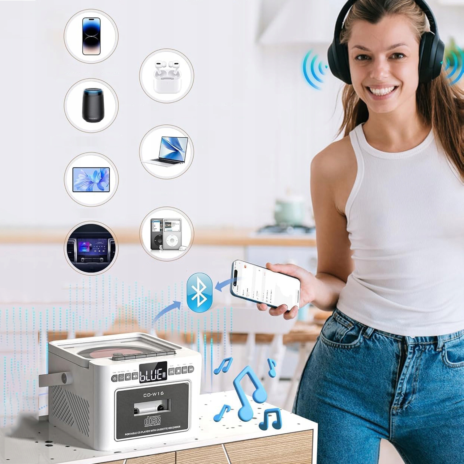 Програвач компакт-дисків пропонує різні варіанти відтворення, включаючи компакт-диски, радіо, касети, Bluetooth 5.1, USB, AUX і SD-карту. Цей касетний програвач має світлодіодний екран і пульт дистанційного керування для зручного керування. Легко перемикайтеся між піснями, регулюйте гучність і вибирайте різні режими відтворення. Завдяки цьому багатофункціональному пристрою ви можете насолоджуватися улюбленою музикою в різних режимах.