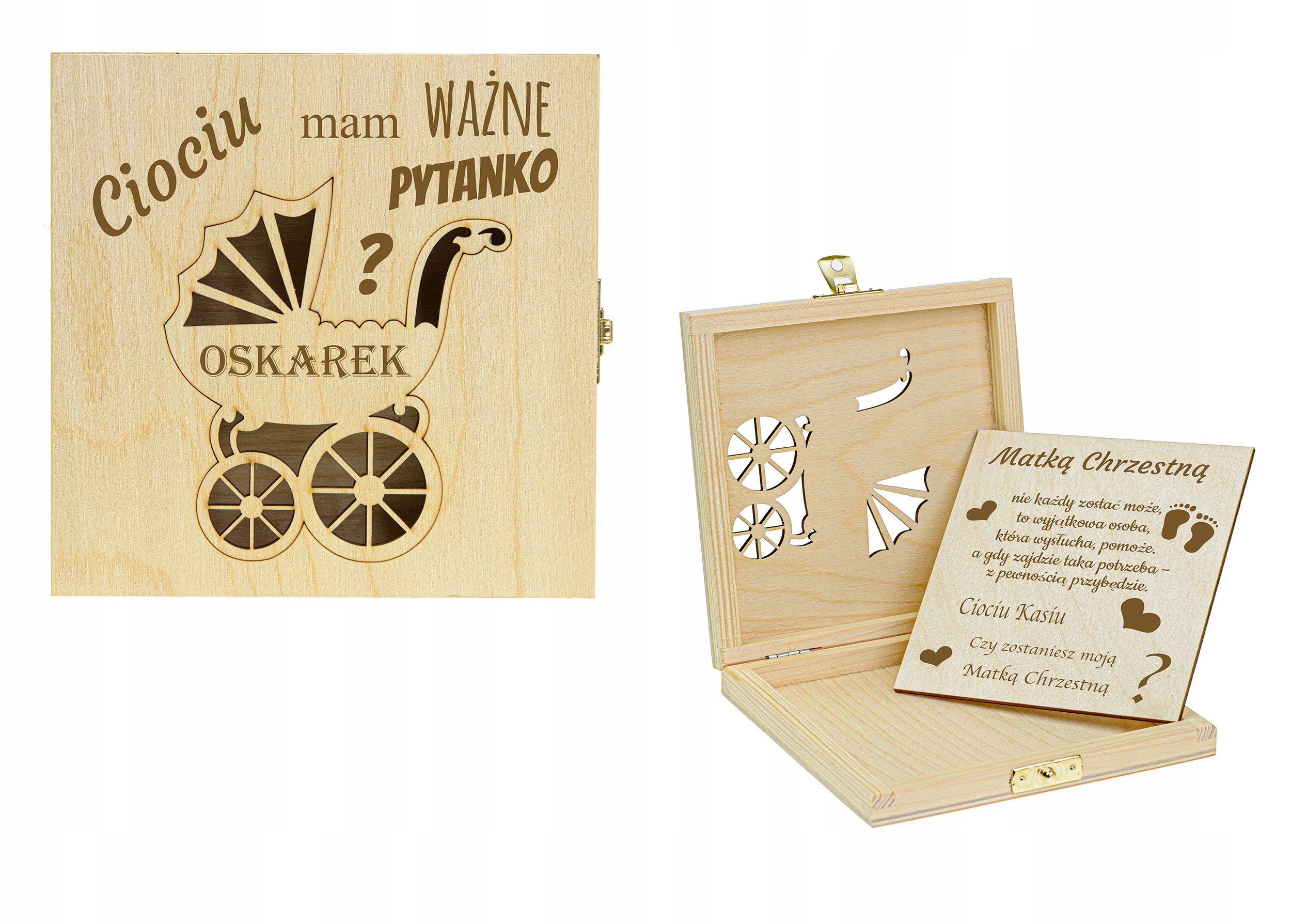 На наступному аукціоні ми представляємо його вам у вигляді дерев'яної листівки в елегантній плоскій коробці. Запит до майбутньої мами або хрещеного батька вашої дитини. Гравірування імен на дерев'яній листівці і чудова присвята, безсумнівно, стануть сувеніром на дуже довгий час. Цей подарунок викличе посмішку на обличчі кожного одержувача.