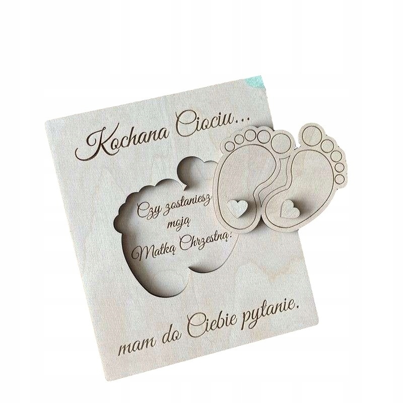 - композиція: прохання бути Богоматері зі знімним елементом у вигляді стоп; прохання має підзаголовки: Шановна тітко... у мене до вас питання.; після прибирання стоп з’являється текст: Ти будеш моєю кумою?; написи вигравірувані та зроблені з увагою до найменших деталей - красива польська ручна робота в екологічному стилі