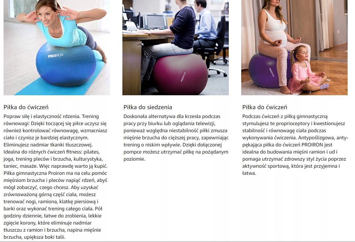 - Універсальність – м’яч для вправ PROIRON стане ідеальним доповненням до вашого дому. тренажерний зал, будь то пілатес, йога, кросфіт або тренування живота. Він також чудово працює як ОФІСНЕ КРІСЛО-М’ЯЧ, покращуючи міцність серцевини та знімаючи біль у спині.