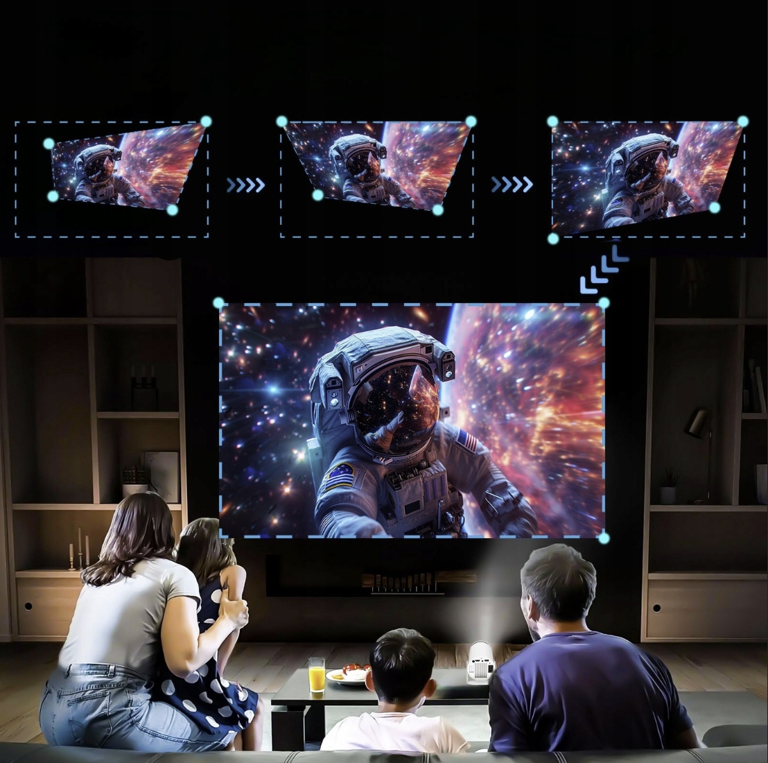 4️⃣ Як зробити зображення рівним? Вбудована корекція Keystone 4D автоматично коригує зображення, а ви можете додатково покращити його за допомогою пульта.