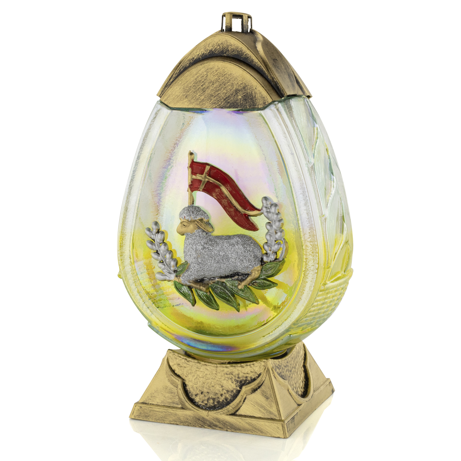 Свічка виготовлена зі скла, а підстава – із пластику. На свічці нанесена аплікація ягняти ручної роботи.