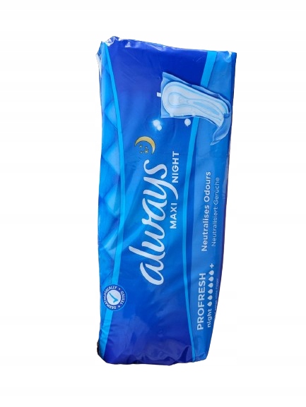 Гігієнічні прокладки Always Maxi Night Profresh без стулок. Завдяки спеціальній технології вони швидко вбирають рідину, утримуючи її всередині та подалі від шкіри. Спеціально профільована форма з розширеними боками запобігає протіканню, а висока вбираюча здатність гарантує повний захист навіть під час сну. Подушечки виготовлені з матеріалів, схожих на бавовну. Вони мають технологію, яка нейтралізує неприємні запахи. Вони дарують комфорт і відчуття сухості та свіжості. Клейка смужка ідеально утримує прокладку на місці, запобігаючи її зміщенню, тому ви можете відчувати себе в безпеці під час кожного руху.