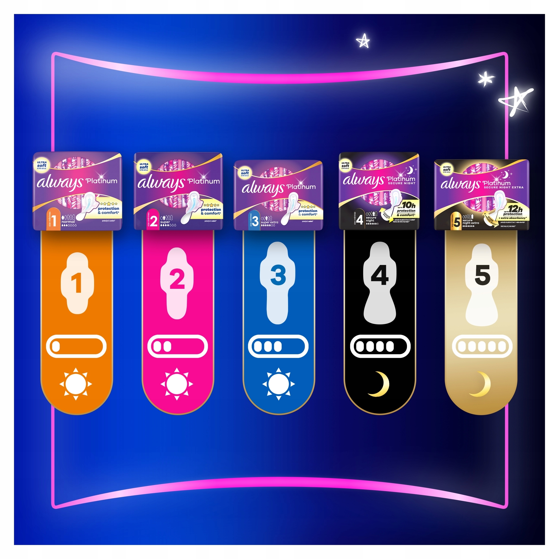 Прокладки Always Platinum були розроблені для кращого прилягання*, щоб вони не протікали, не рухалися та не створювали дискомфорту. Завдяки гігієнічним прокладкам Always Platinum ви можете спати міцно. Always Platinum Secure Night Extra (розмір 5) має на 85%* більшу задню частину, що забезпечує кращий захист там, де це найбільше потрібно. * порівняно з Always Platinum Normal (розмір 1)
