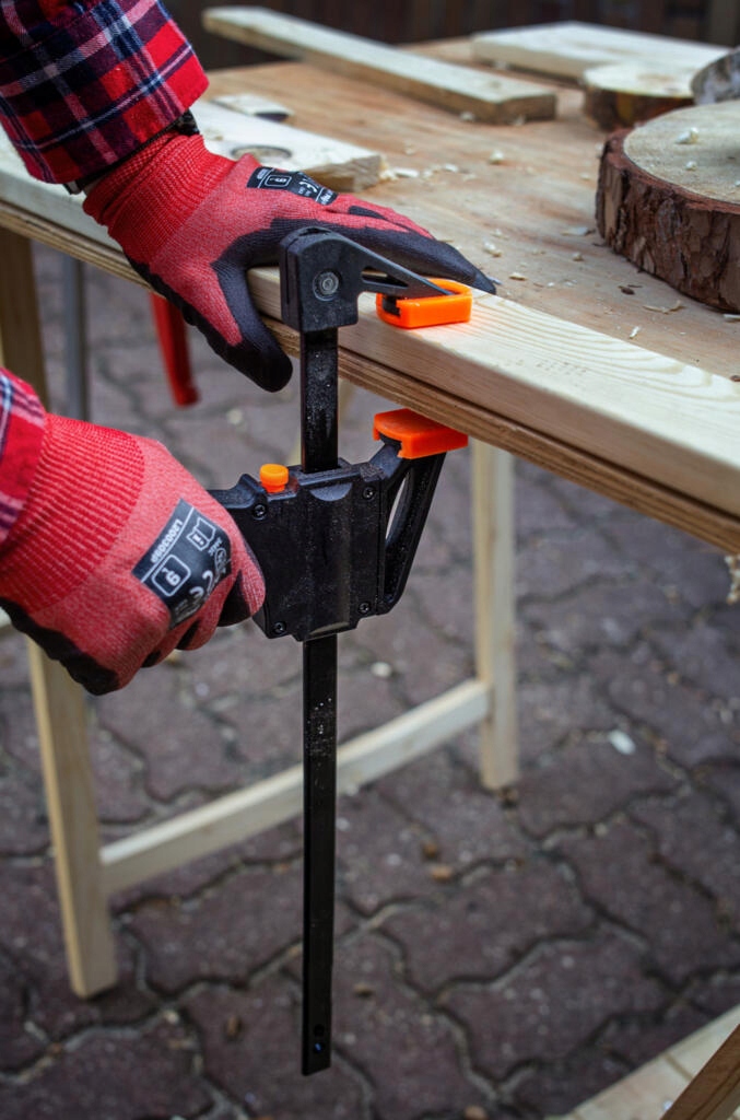Столярний зажим Proline, що дозволяє швидко рухатися однією рукою. Він має можливість переміщати верхню щелепу та використовувати затискач як розширювач.