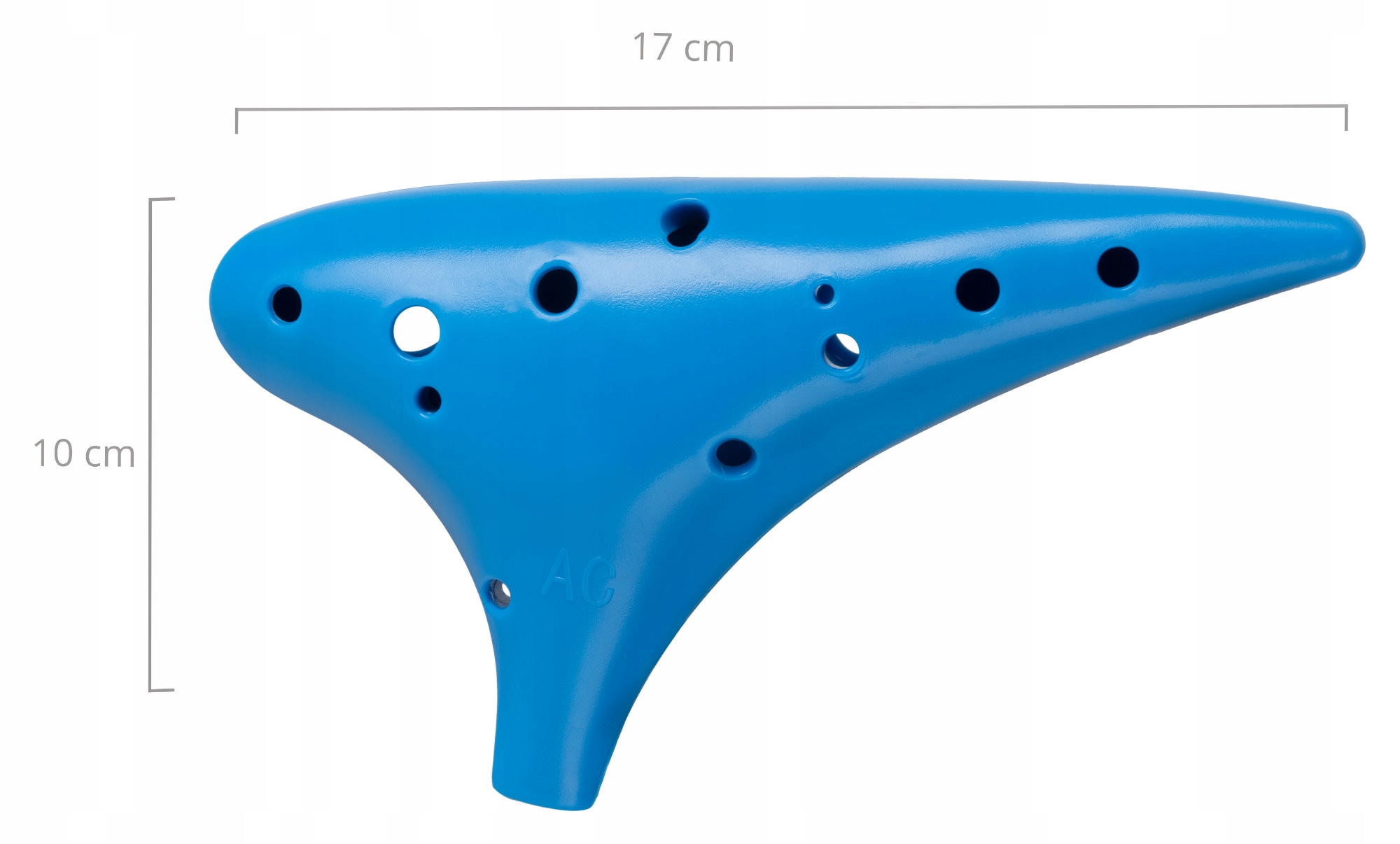 Окарина синього кольору, що привертає увагу, виготовлена з міцного пластику в альтовому ладі C з тональним діапазоном c'' - f''. Інструмент має загалом 12 тонів і дуже м’який і теплий звук.