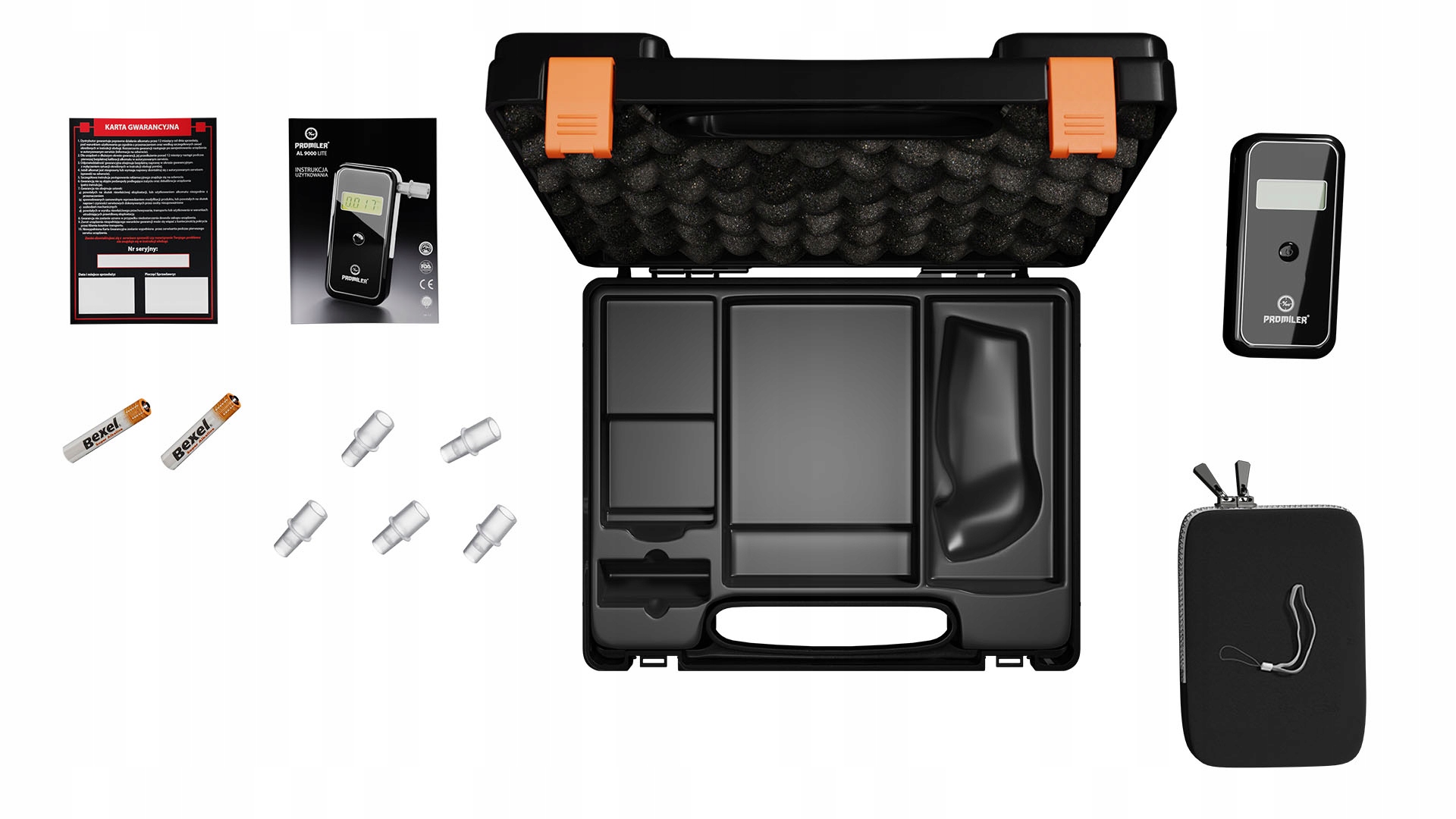 Алкотестер, сертифікований Promiler. AL 9000 Lite - висококласний цифровий алкотестер, який використовується для вимірювання вмісту алкоголю в крові на основі аналізу видихуваного повітря. Наразі це найкращий алкотестер на ринку в ціновій групі до 600 злотих. Тестер базується на надзвичайно точному та стабільному електрохімічному датчику, розробленому спеціально для цієї моделі алкотестера. Завдяки новому сенсору «поліцейську» техніку можна віддати в руки звичайних користувачів. Ресурс датчика становить понад 2000 вимірювань, а його калібрування не потрібна так часто, як у алкотестерів нижчого класу - виробник рекомендує проводити калібрування кожні 1000 вимірювань. Алкотестер запам'ятовує загальну кількість проведених вимірювань, що полегшує визначення необхідності калібрування. Програмне забезпечення AL 9000 Lite може перевірити правильну роботу датчика та стан заряду акумулятора. AL 9000 L також має контроль потоку повітря, щоб забезпечити відповідний об’єм досліджуваного зразка.