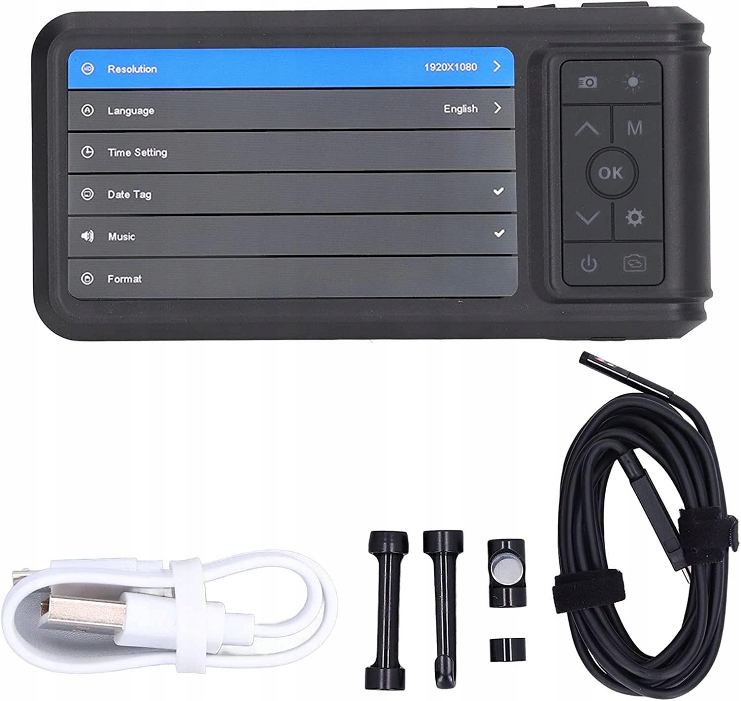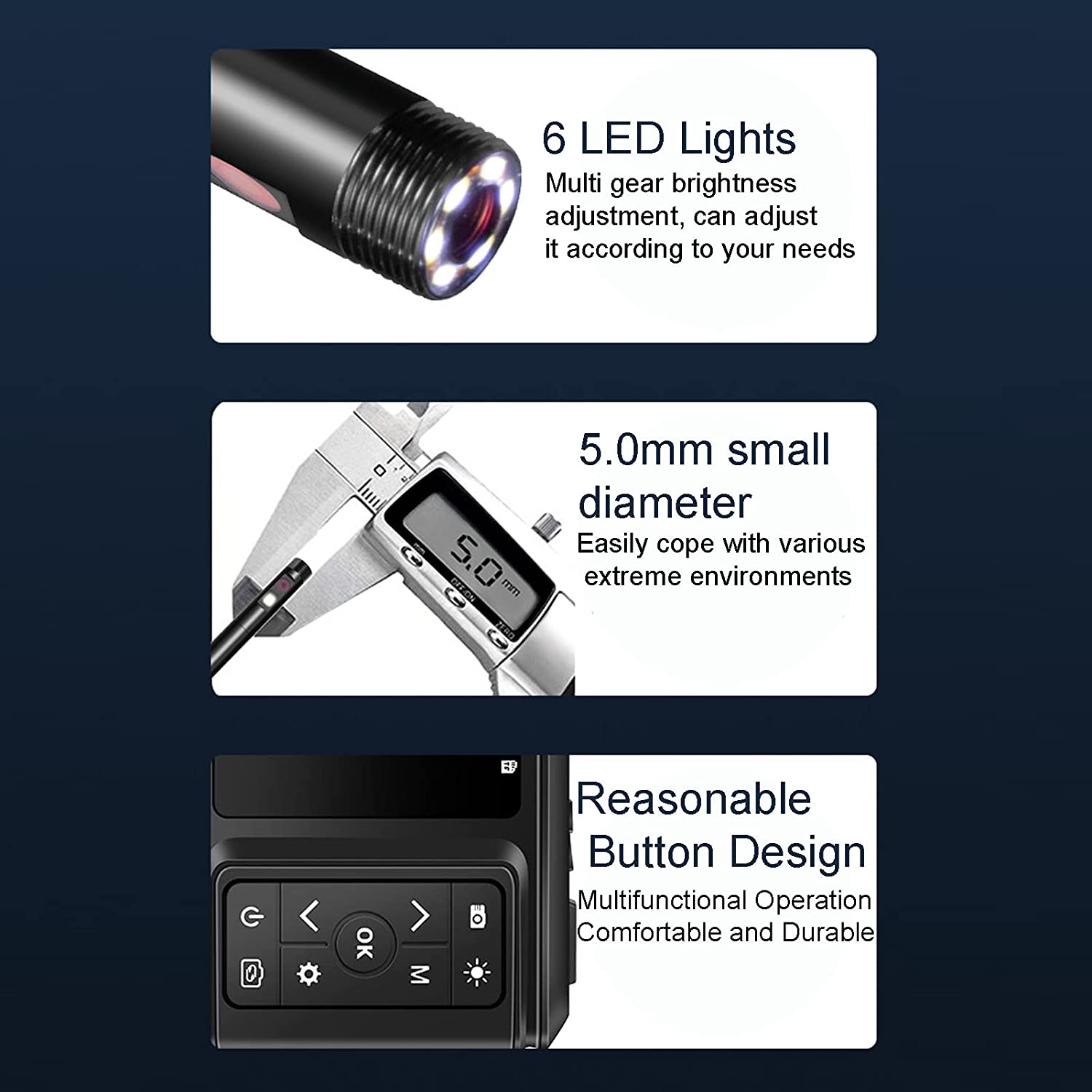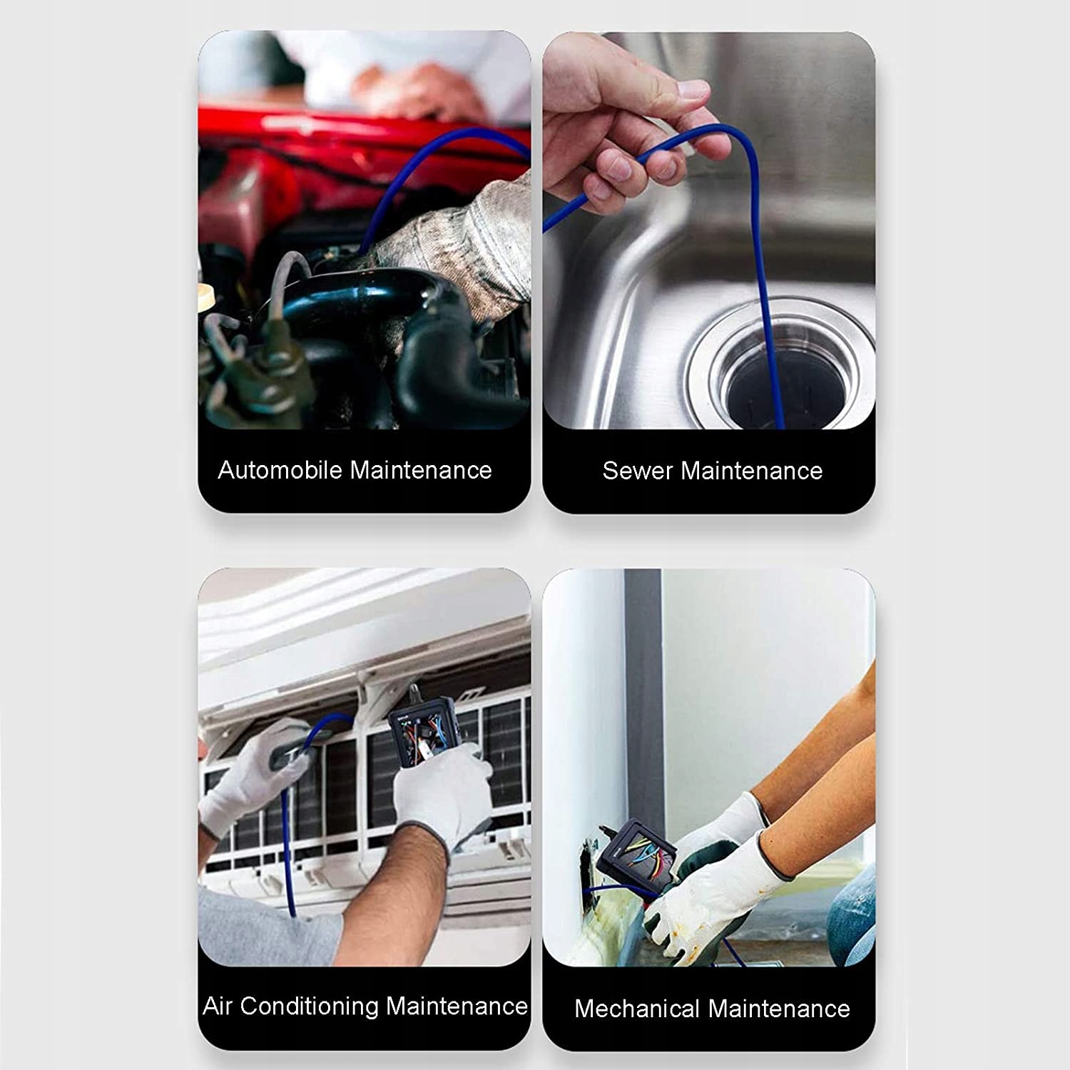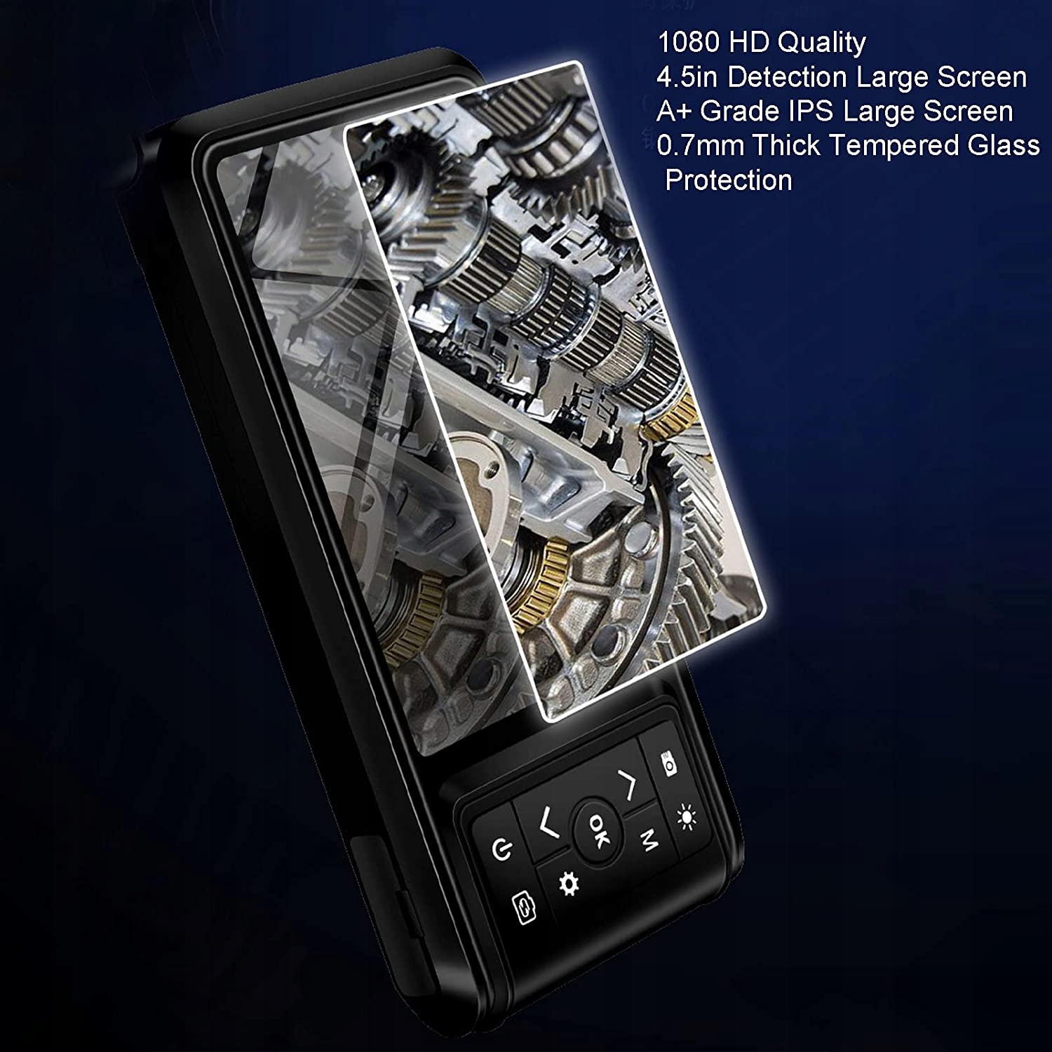 У високочутливому чіп-ендоскопі використовується чіп, який забезпечує чудову якість зображення та хорошу роботу в умовах слабкого освітлення, не турбуючись про поточне оточення. Радіус повороту 25 см. Радіус повороту цієї інспекційної камери становить лише 25 см, що можливо завдяки вузьким і вигнутим зазорам. Вбудована високопродуктивна літієва батарея Ендоскоп оснащено вбудованою літій-полімерною батареєю ємністю 2500 повна потужність мАг, низьке енергоспоживання та тривалий термін служби. Універсальне використання ендоскопа широко використовується для обслуговування автомобілів, обслуговування повітропроводів, обслуговування кондиціонерів, технічне обслуговування механічного обладнання тощо. Водонепроникний IP67 Цей ендоскоп має водонепроникний IP67, внутрішня сторона лінзи заклеєна спеціальним клеєм. який підходить для підводних операцій