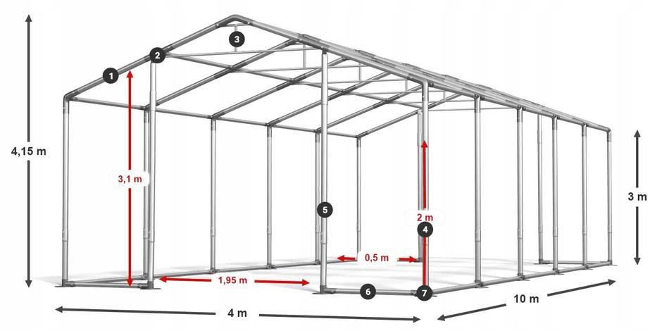 1 - Конструкційні труби fi 50 мм 2 - Конструкційні з'єднувачі fi 54 мм 3 - Посилена конструкція даху 4 - Міцні подвійні гвинти через 5 - Посилення< /b > входи 6 - Посилена конструкція підлоги 7 - Збільшені фути fi 14 см