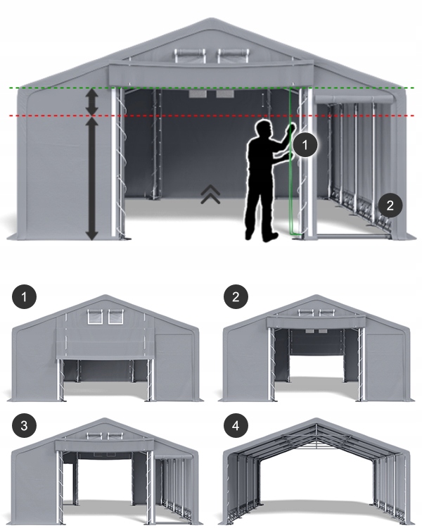 Модульна конструкція дозволяє легко збільшувати або зменшувати висоту намету. Для цього використовується додатковий підйомний комплект у вигляді міцних сталевих труб довжиною 0,5м або 1м.