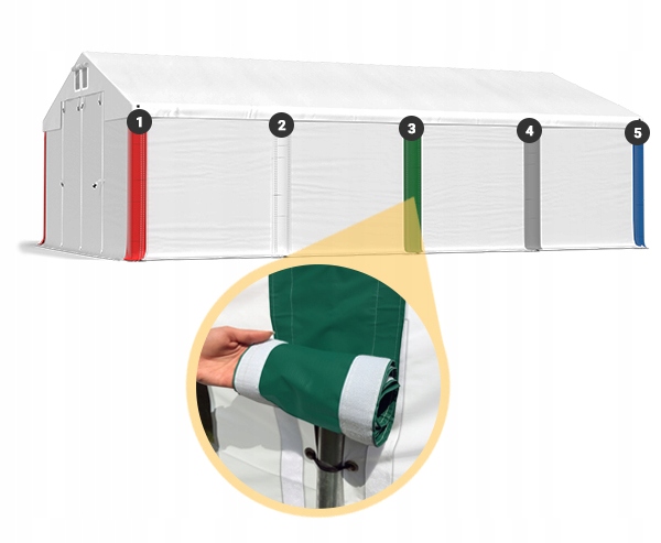 1 - Покрівля SD ПВХ (полівінілхлорид) 560 г/м2 2 - Подвійна вентиляція з обох сторін 3 - Ковзаючі входи 4 - Міцні блискавки YKK на входах 5 - Ущільнювальна липучка 6 - Змінна Маски з ущільнювальною липучкою 7 - Бічні стінки SD PVC приблизно 2 x 2 м (полівінілхлорид) 500 г/м2 8 - Додатковий утримуючий фартух