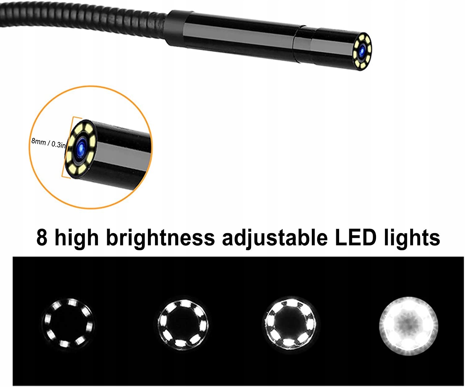 Зонд оснащений передньою лінзою та боковою лінзою, які забезпечують чітке зображення під різними кутами. Бокова лінза може отримувати чіткіші зображення, ніж аксесуари для бічних дзеркал, на основі відбиття світла. Дисплей із подвійним кутом, на екрані дисплея можна одночасно бачити передній план і вид збоку, краще захоплювати все для легкого спостереження. Промисловий ендоскоп, який в основному використовується для технічного обслуговування кондиціонерів і виявлення трубопроводів. Оснащений акумулятором на 2600 мАг, час автономної роботи становить близько 3 годин із заставкою, ви можете встановити інтервал вимкнення екрана.