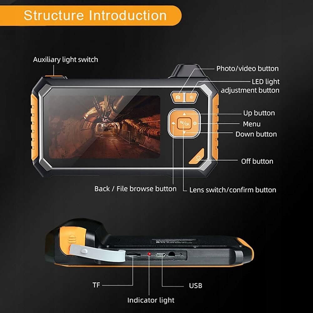 43-дюймовий РК-екран 1080P HD Ендоскоп має 43-дюймовий РК-екран 1080P HD, виготовлений із твердого скла та забезпечує захист від подряпин і потертостей. Покращена технологія горизонтального обертання забезпечує винятково чіткі зображення в будь-який час, забезпечуючи зображення високої якості з вищою насиченістю та більш яскравими кольорами. Камера ендоскопа діаметром 8 мм Камера бороскопа діаметром 8 мм дозволяє безперешкодно досліджувати вузькі ділянки. У Snake Camera входить захисний футляр, рефлектор, опорний гачок, магнітна присоска. Широко використовується для перевірки промислового обладнання, ремонту автомобілів, кріплення трубопроводів, перевірки домашнього кондиціонування повітря, перевірки конструкції стін. Кабель типу «змійка» та регульоване аварійне освітлення Напівребристий кабель під’єднується до 6 світлодіодних лампочок, а також до трьох рівнів регулювання яскравості та додаткових аварійних світильників, що забезпечує легку роботу навіть у темряві. Регульована фокусна відстань досягає 15197 дюймів38500 см. Можна чітко зафіксувати як близькі, так і далекі гарячі точки. Акумулятор ємністю 1700 мАг і 6 місяців роботи в режимі очікування Оснащений акумулятором високої ємності 1700 мАг, що забезпечує до 4 годин роботи в режимі очікування і до 6 місяців. Вам більше не доведеться турбуватися про перебої в електропостачанні під час використання ендоскопа. Водонепроникна технологія IP67 і бездоганна робота 100. Промисловий ендоскоп забезпечує водонепроникну технологію IP67 із заглибленням у воду на глибину 1 метра протягом 60 хвилин безперервного використання. Він повністю задовольнить ваші щоденні потреби. Краще використовувати карту TF на 64 ГБ, яка не входить до комплекту.