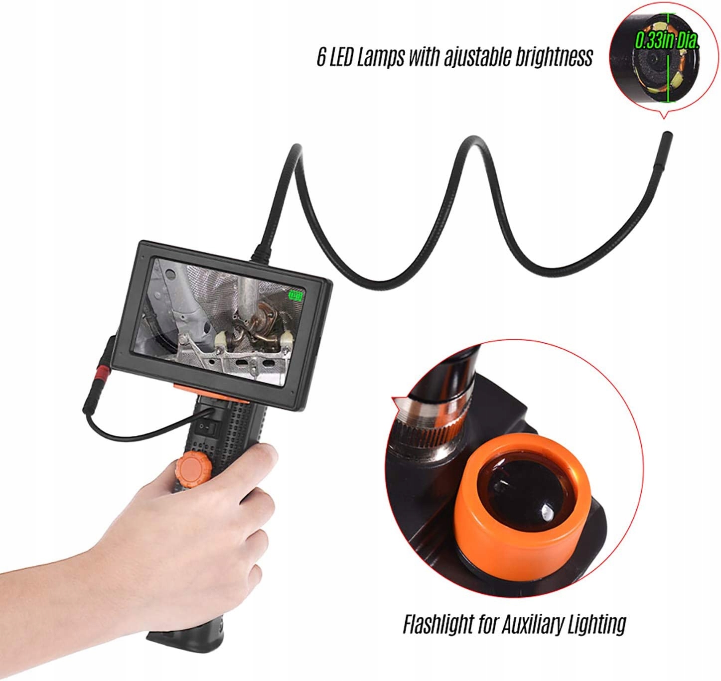 Камера високої роздільної здатності цього ендоскопа забезпечує чудові враження. Цей ендоскоп може бути придатним для різних типів навколишнього середовища, наприклад, із слабким освітленням, темрявою, вологою чи вологою зоною тощо. Оснащений гнучким напівжорстким кабелем, який може згинатись і зберігати форму, щоб отримати доступ до різноманітних обмежених місць, таких як вигнуті отвори чи труби. Ви можете виконувати аналіз в реальному часі в області застосування для подальшого покращення візуального контролю та виявлення дефектів. Він широко використовується в таких сферах, як технічне обслуговування автомобілів, ремонт механічних оглядових труб, технічне обслуговування будинків тощо.