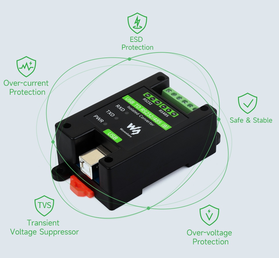 Система TVS, запобіжник із самовідновленням і захисні діоди ефективно захищають пристрій від перенапруг, перевантажень і електростатичних розрядів.