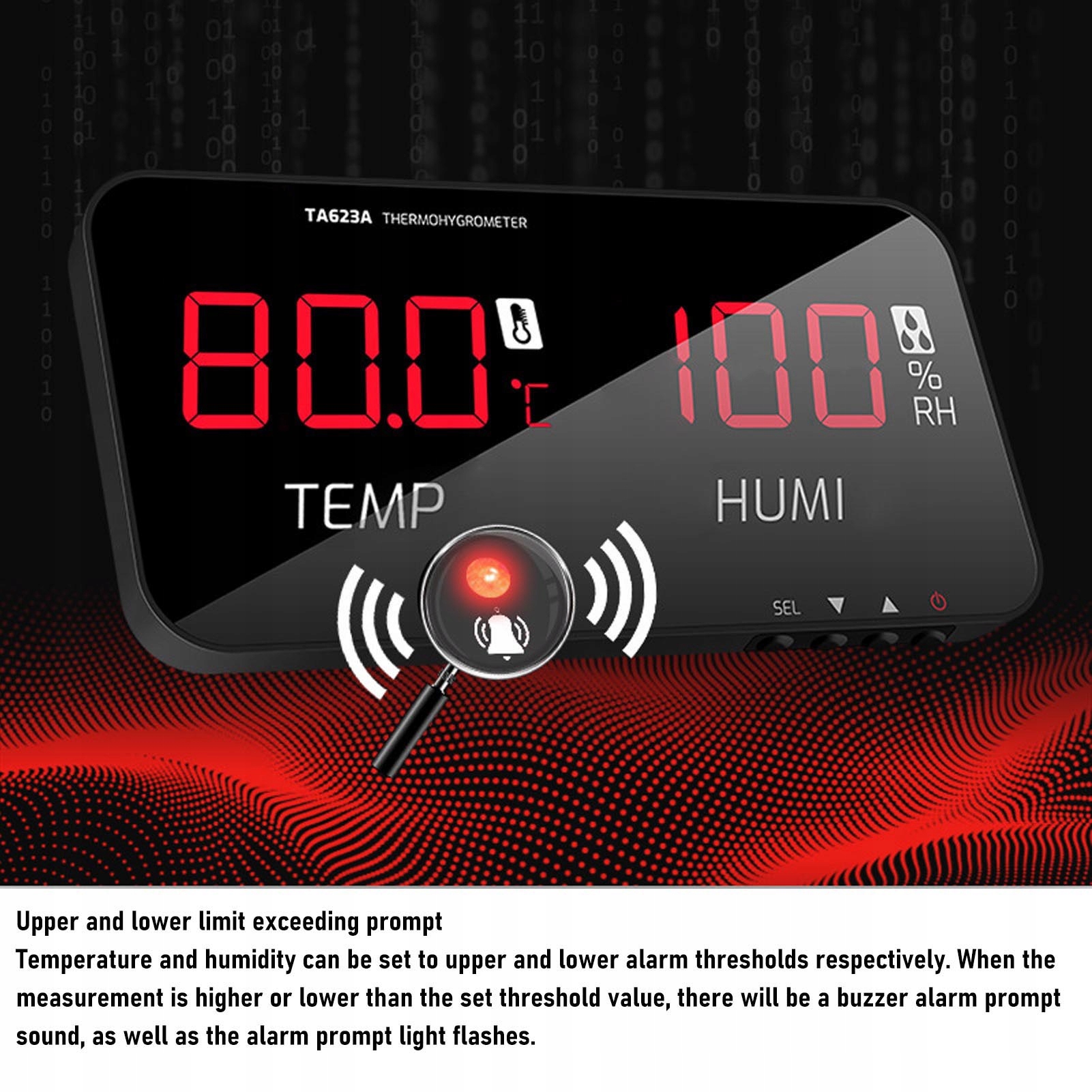 4. Настроювана система сигналізації: користувачі можуть встановлювати верхні та нижні порогові значення як для температури, так і для вологості, що запускає звукові сигнали та миготливі індикатори, якщо вимірювання перевищують ці порогові значення. Ця передова система оповіщення допомагає вам бути в курсі умов навколишнього середовища, забезпечуючи своєчасне втручання, коли це необхідно.