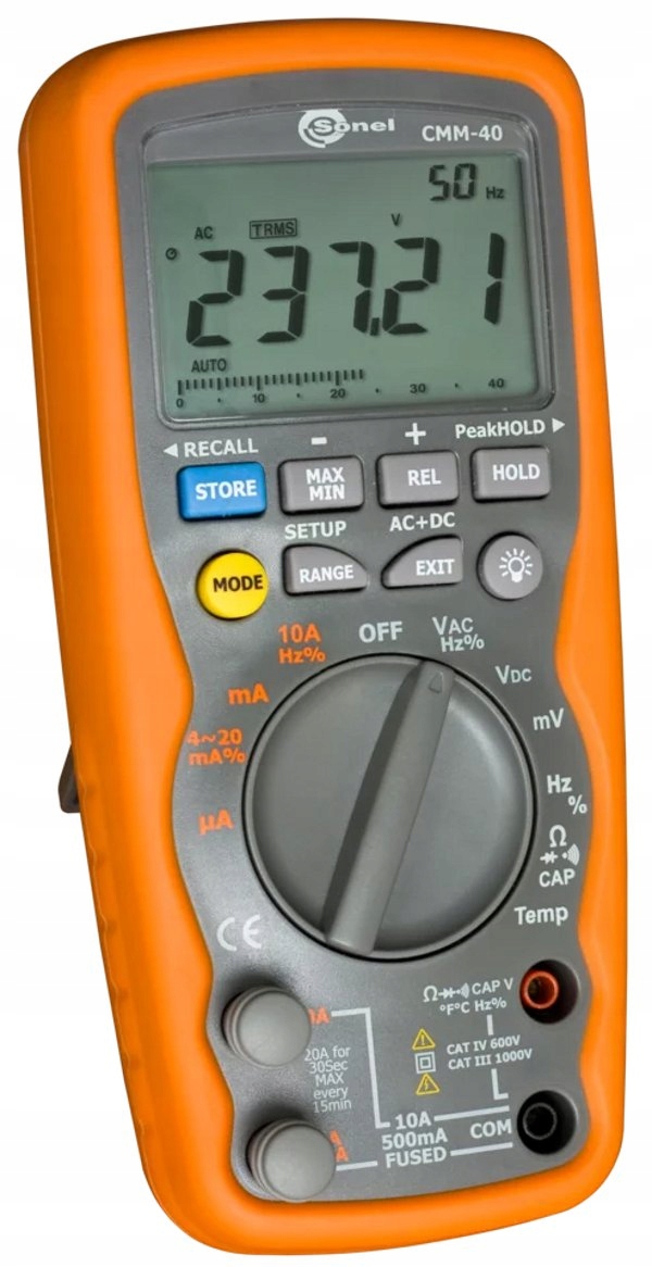 Надзвичайно міцний і універсальний Промисловий мультиметр Sonel CMM-40 – це пристрій із широкими вимірювальними можливостями, призначений для промислових, сервісних робіт тощо. Він використовується, серед іншого, для вимірювання напруги та струму (DC і AC TRUE RMS), а також прилад дозволяє вимірювати ємність, частоту, робочий цикл (наповнення), безперервність з'єднання, опір і температуру. Додаткові функції, такі як автоматична або ручна зміна діапазону, функція HOLD, функція утримання пікового значення або функція REL, ще більше розширюють можливості цього пристрою.