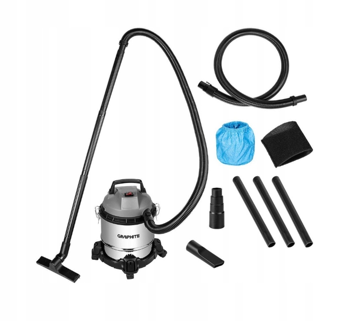 Пилосос оснащений шлангом діаметром 32 мм і довжиною 2 м бак виготовлений з корозійностійкої нержавіючої сталі. Комфорт використання забезпечує 2-метровий шнур живлення. Пилосос GRAPHITE має тканинний і поролоновий фільтр.