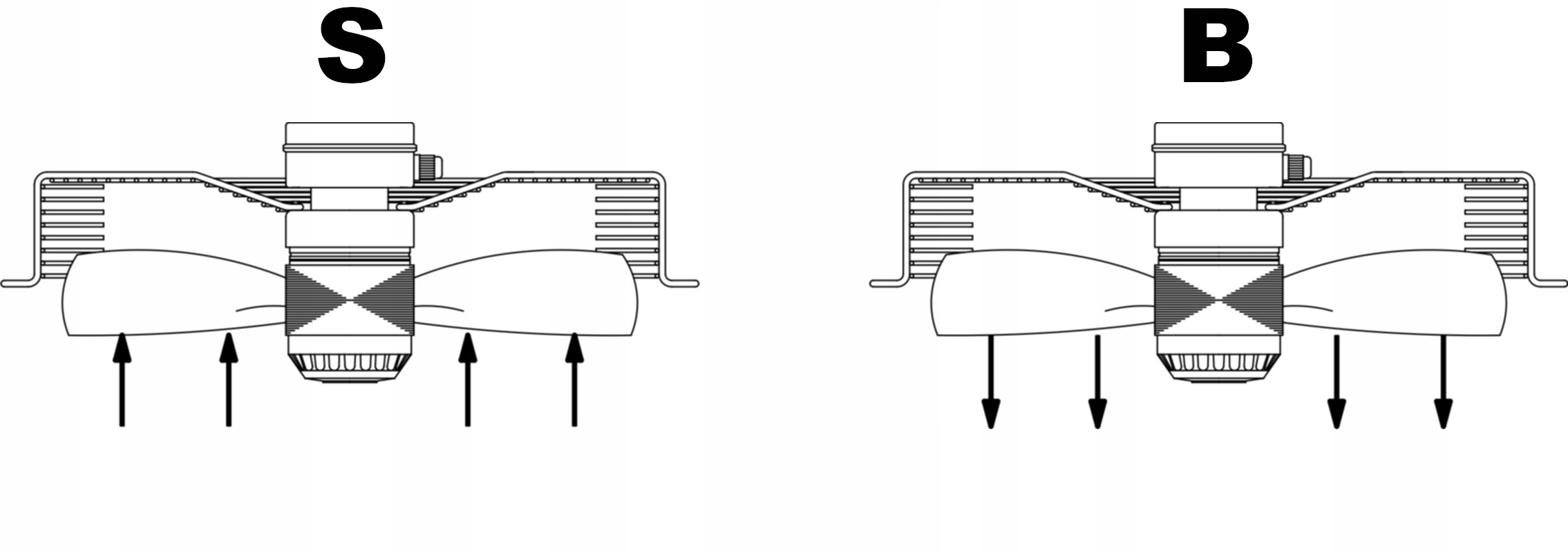 - B (прямий / витяжний): вентилятор виштовхує повітря, видаляючи його зсередини пристрою або кімнати.