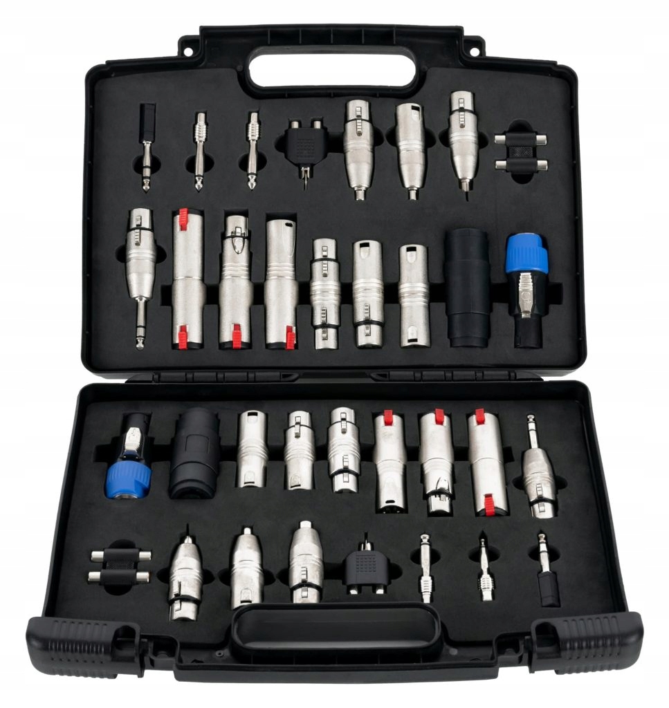 Корпус містить 34 різні адаптери (більшість у парах), які дозволяють навіть найнезвичайніші підключення. Від невеликих смартфонів до мікрофонів і пасивних динаміків асортимент включає відповідний роз’єм для кожного з’єднання. Щоб справді бути готовим до будь-якої ситуації, усі деталі знаходяться в надійному корпусі.