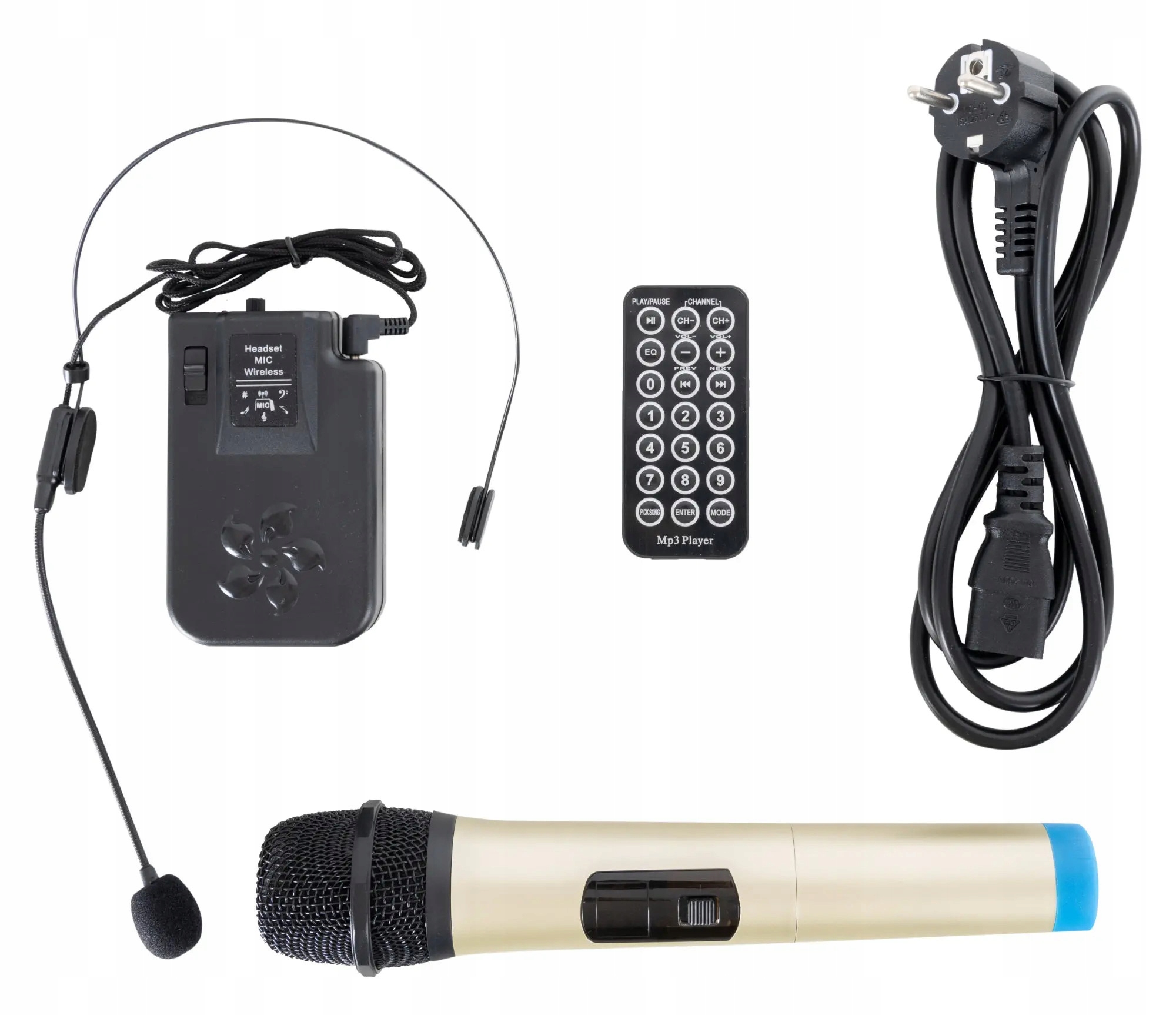 Мобільна звукова система з потужністю 30 Вт (RMS), підключення Bluetooth з TWS, що дозволяє бездротову роботу стерео. Набір оснащений акумулятором з автономністю до 5 годин і оснащений 12-дюймовим динаміком. Має вбудований USB, SD mp3-плеєр. Він також включає в себе бездротовий мікрофон, гарнітуру з радіусом дії до 50 м і окремий регулятор гучності. На додаток до бездротових мікрофонів, ви можете підключити два додаткових дротових мікрофона. Ви також можете підключити гітару, бас-гітару або інші інструменти за допомогою одного з роз'ємів 6,3 мм. Збалансований вхід XLR із кнопкою MIC/Line доступний як вхід сигналу з міксу або попереднього блоку. Щоб регулювати загальну гучність, є практичний основний регулятор гучності. Він також має 3-смуговий головний еквалайзер із басами, середніми та високими частотами. Колонка має висувну ручку і два твердих колеса для зручності транспортування. Обладнання оснащене пультом дистанційного керування.