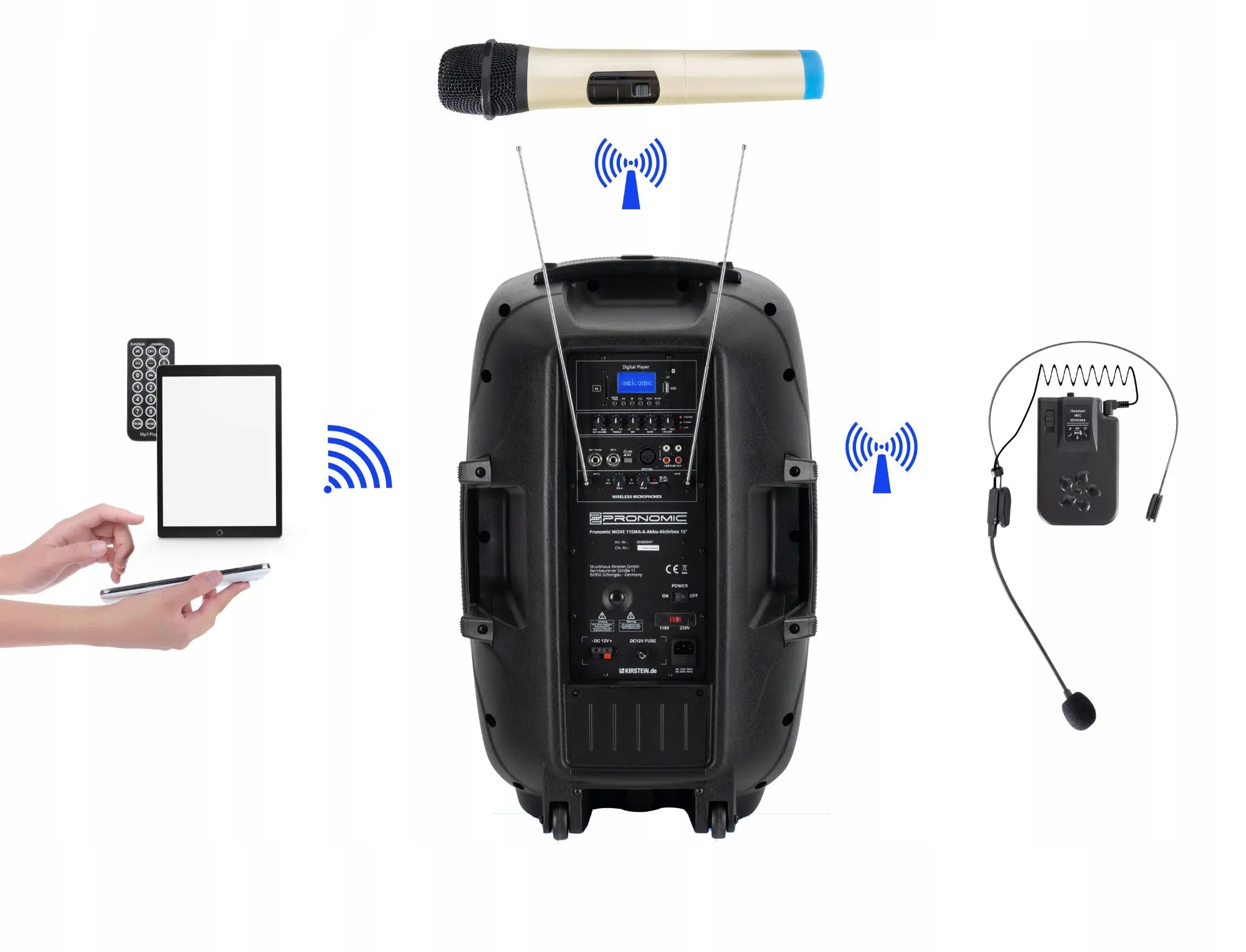 - У комплекті: кабель живлення, бездротовий мікрофон, гарнітура та пульт дистанційного керування