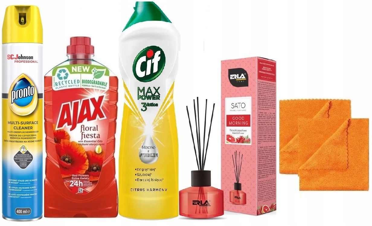 PRONTO ПІНА ДЛЯ МЕБЛІВ AJAX CIF ОСВІЖУВАЧ МОЛОКА ERLA МІКРОФІБРА НАБІР
