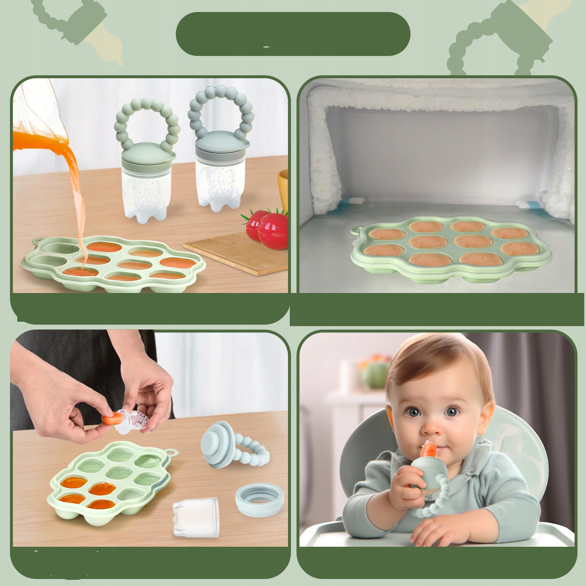 Поради: Силіконовий матеріал годівниці робить нашу Контейнери для фруктових пустушок стійкі до плям. Знебарвлення зазвичай відбувається лише тоді, коли годівниця використовується з помаранчевими овочами, такими як морква, гарбуз і солодка картопля. Це пов’язано з наявністю бета-каротину в барвнику.