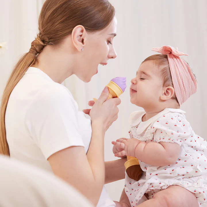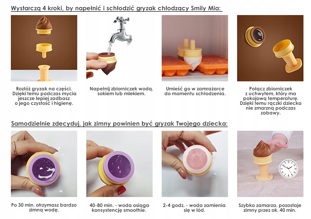 Прорізувач для зубів Smily Mia у формі смачного морозива був створений, щоб краще полегшити біль і дискомфорт, пов’язані з прорізуванням зубів. Просто відкрутіть його, налийте в резервуар води, поставте резервуар в морозилку до замерзання, потім дістаньте його, покрутіть прорізувач і дайте дитині. Ваш малюк не зможе встояти перед смачним морозивом, яке додатково охолодить його ясна, полегшить прорізування зубів.