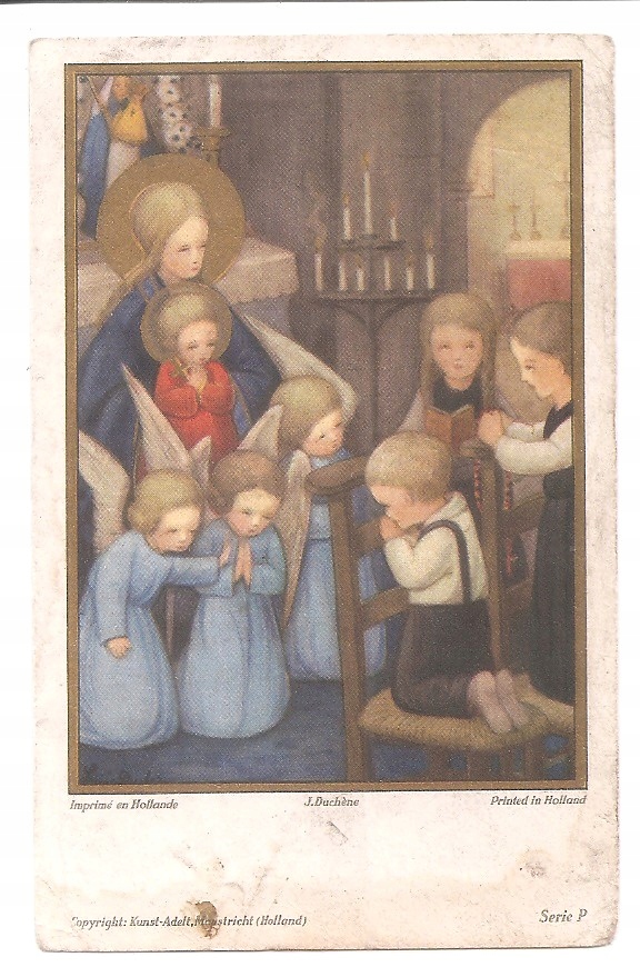 Скан показує предмет аукціону. Це зображення, на якому зображена молитва. Він походить з Нідерландів, швидше за все, з 1970-1980-х років. Хороший загальний стан. Невеликі забруднення, плями та складки. Розміри 105 х 68 мм.