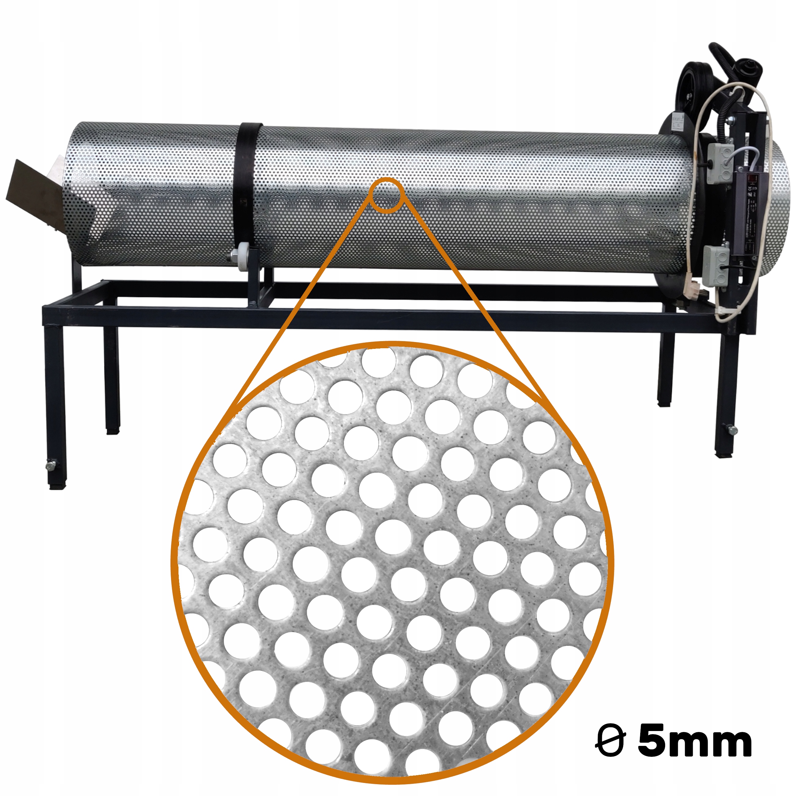 3️⃣. Барабан сита - виготовлений з матеріалів найвищої якості для забезпечення тривалого та комфортного використання всього пристрою. «Направляючі» з товстої безшовної труби (7мм) для уникнення пропуску барабана при його обертанні. Барабан може бути виготовлений з різних матеріалів - від оцинкованого металу до листового металу конідур або навіть тканої сітки! На цьому аукціоні ви купуєте барабан з діаметром вічка 5 мм!