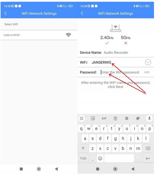 Через деякий час пристрій буде знайдено програмою (натисніть на назву пристрою) і необхідно буде вказати мережу WIFI, в якій буде працювати прослуховування. Виберіть мережу 2,4 ГГц