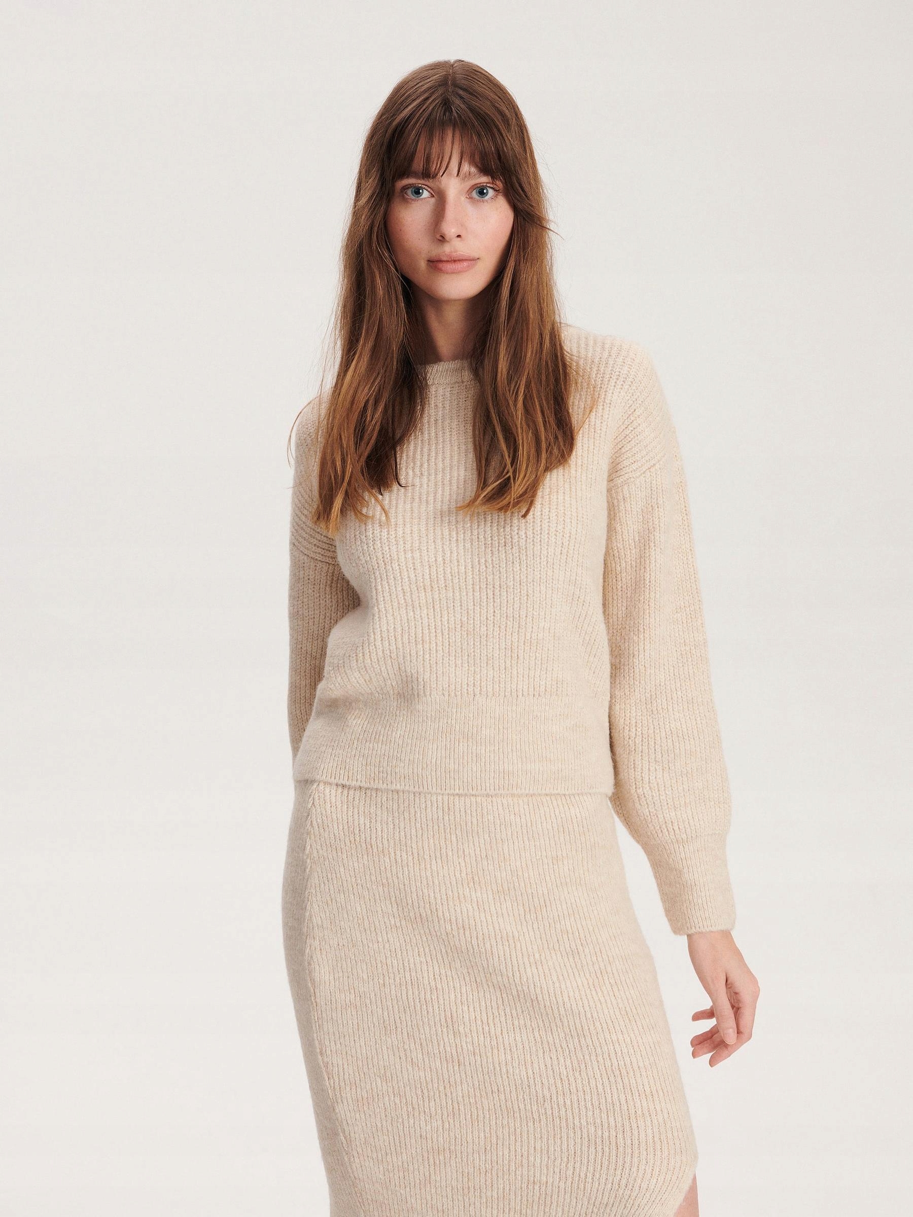 PROSTA KLASYCZNA BEŻOWA DZIANINOWA SPÓDNICA MIDI ROZCIĘCIE S
