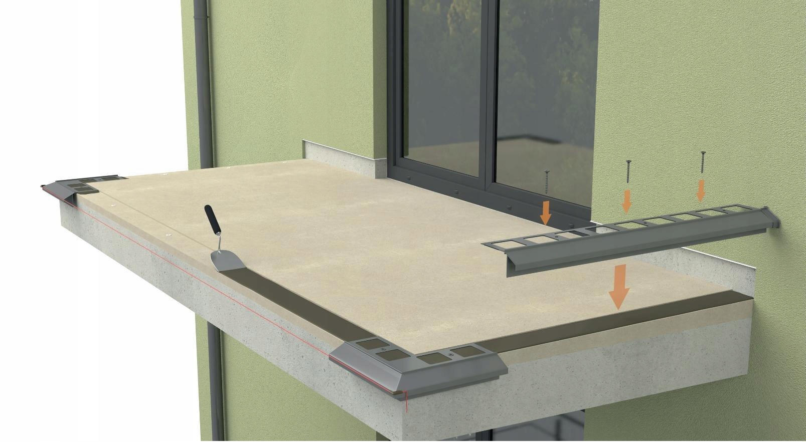 Куточки вбудовуються в ущільнювальний розчин, а потім механічно виправляються за допомогою попередньо вбудованих дюбелів розчину. Ми затягаємо гвинти після зв'язування ущільнювальної маси.