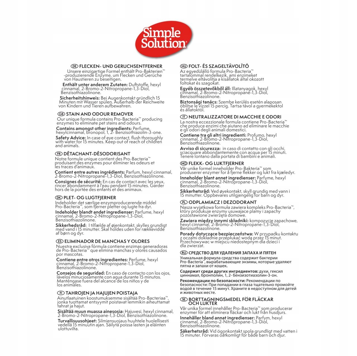 Simple Solution Stain & Odor Remover – це засіб для виведення плям і дезодорант з унікальною формулою, що містить комплекс Pro-Bacteria, який виробляє ферменти, які видаляють плями та запахи, залишені домашніми тваринами. Завдяки високій ефективності рекомендується для органічного видалення стійких плям сечі, калу та блювотних мас. Він ідеально підходить для видалення плям і запахів з таких поверхонь, як килими, оббивка, ліжка, одяг.Він містить, серед іншого, інгредієнти: ароматичні композиції, гексилциннамаль, 2-бром-2-нітропропан-1,3-діол, бензізотіазолінон. Рекомендації щодо безпеки: при попаданні в очі ретельно промити водою протягом 15 хвилин. Зберігати в недоступному для дітей та тварин місці.