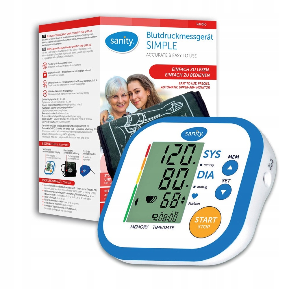 Ви шукаєте надійний, простий у використанні тонометр для щоденного використання? Модель SIMPLE Sanity TMB-1491-DS - ідеальне рішення для Вас! У цьому автоматичному тонометрі на плечі використовується сучасний метод вимірювання «ЗНИЗУ» (система FDS — Fast & Delicate System), завдяки якому вимірювання відбувається швидко, м’яко та надзвичайно точно.