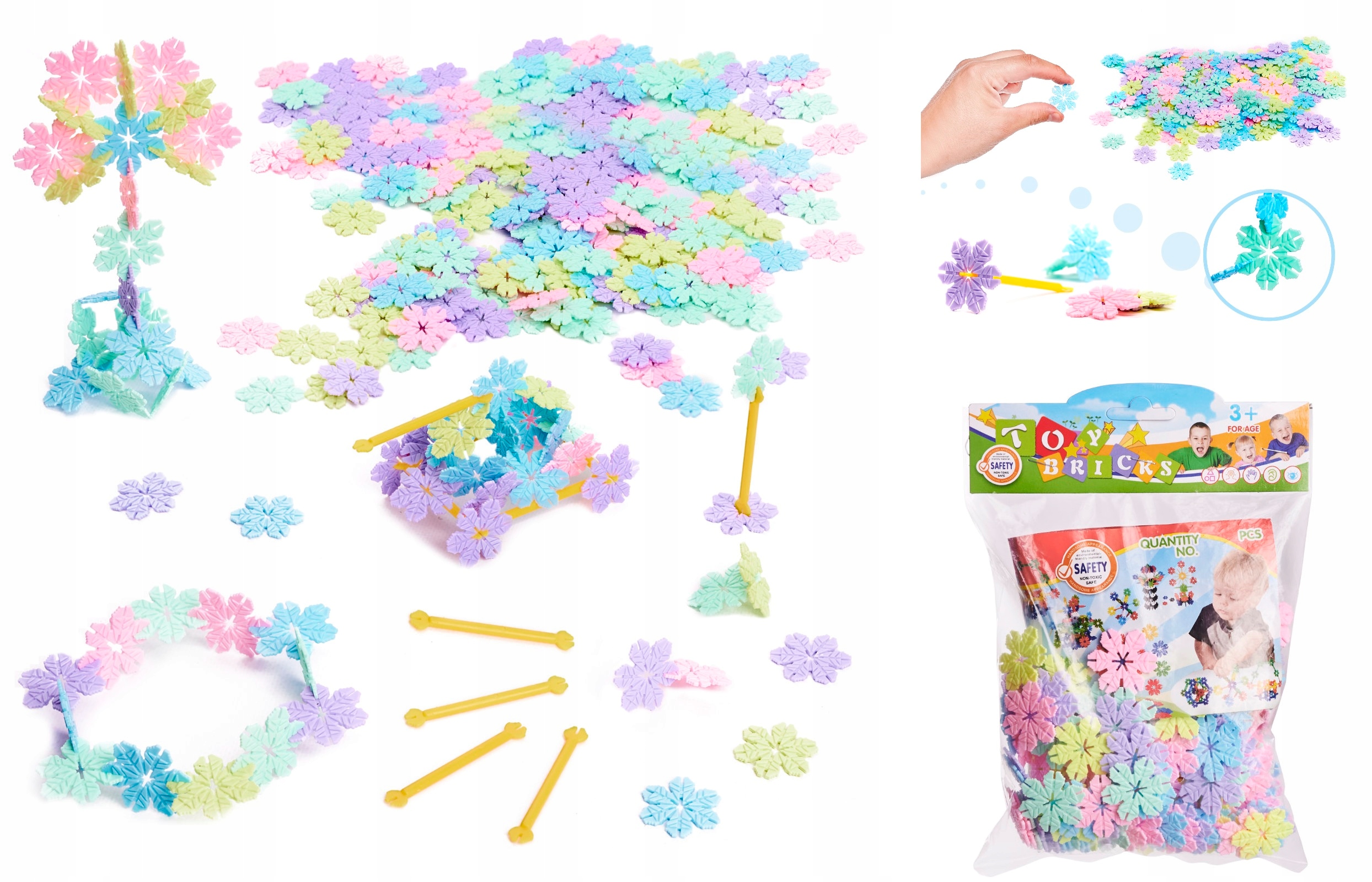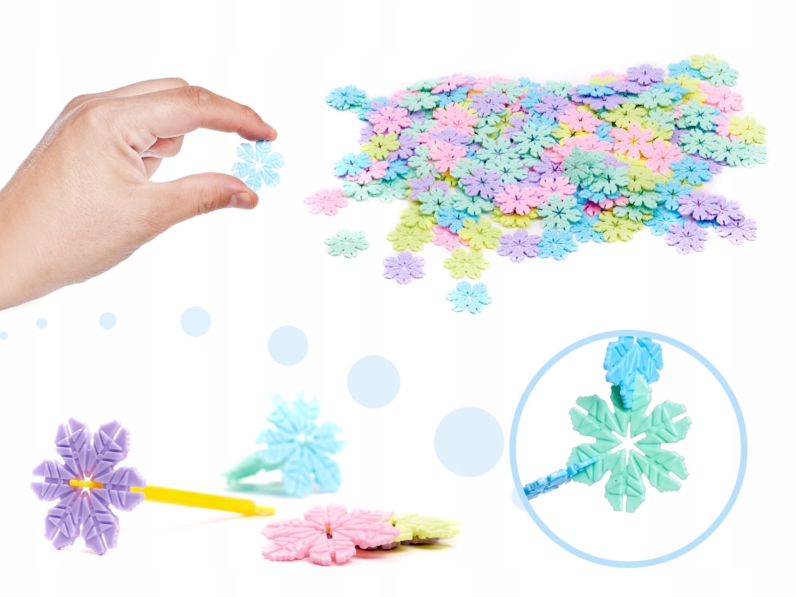 Набір різнокольорових блоків у формі сніжинок із пластику. З ними можна створювати різноманітні конструкції та візерунки, які під силу вашій фантазії. Дизайнер може бути обмежений лише своєю фантазією та кількістю блоків у наборі.