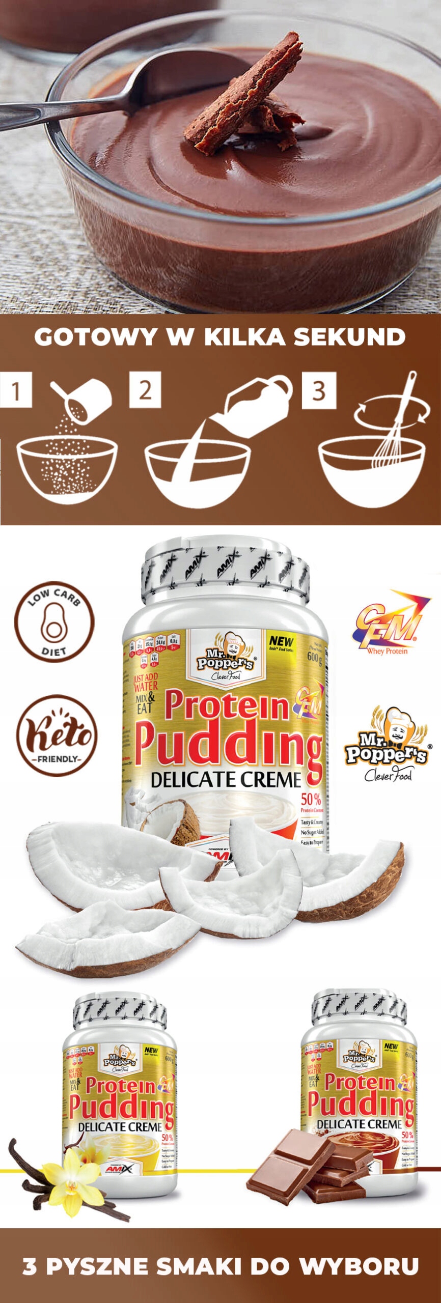 Ми впевнені, що якщо ви спробуєте цей вершковий десерт один раз - ви більше ніколи не потягнетеся до «нормальних» солодощів! При вживанні білкового, шоколадного, кокосового або ванільного пудингу Protein Pudding AmixMr. Серія Поппера ви не згрішите, і ви навіть допоможете собі. Ви можете їсти його після їжі, наприклад, як перекус, щоб збільшити споживання білка - що точно вам допоможе - або коли захочеться. Ви можете споживати його цілий день, коли вам це дуже потрібно