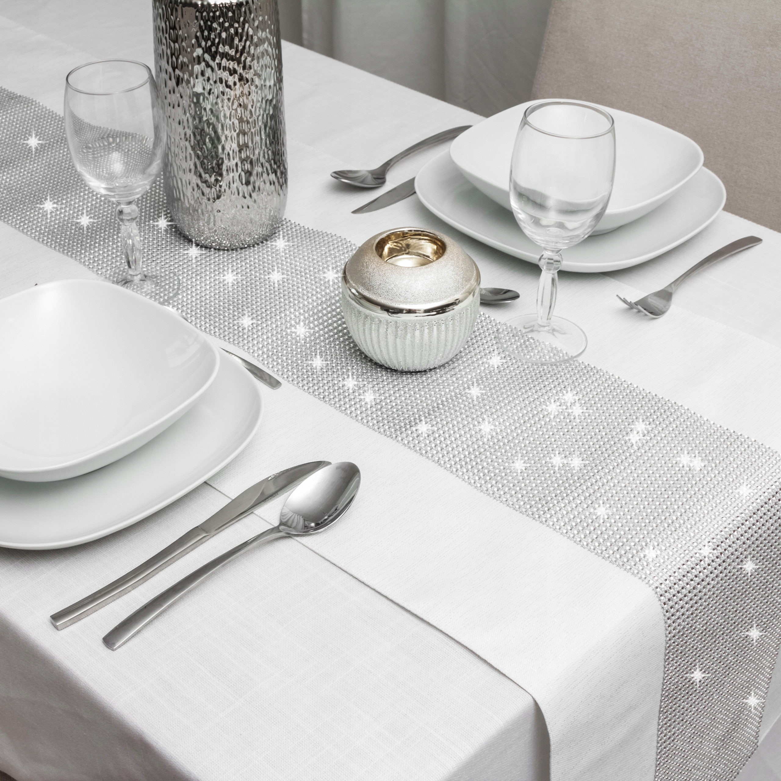 ✅ Настільні доріжки, що поєднують люрексову тканину з кубічним цирконієм, є ідеальним відображенням розкоші та сучасності. Кольори від білого до сірого та чорного підходять для різноманітних інтер’єрів.