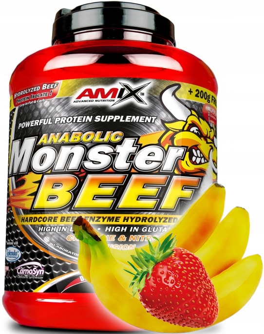 Anabolic Monster Beef Protein, - це продукт, який на 90% складається з яловичого альбуміну, який наразі є найякіснішим джерелом білка на ринку. Завдяки гідролізу час перетравлення білка значно скорочується. Monster Beef також збагачений моногідратом креатину, що підвищує енергетичний потенціал, енергію, регенерацію та зростання м'язової маси. Monster Beef також містить Nitro Shot Complex, завдяки якому всі необхідні інгредієнти будуть миттєво доставлені до м'язових волокон. Цей продукт також містить Phosphomatrix, який забезпечує всі необхідні мінерали, які відіграють ключову роль в організмі кожного спортсмена.