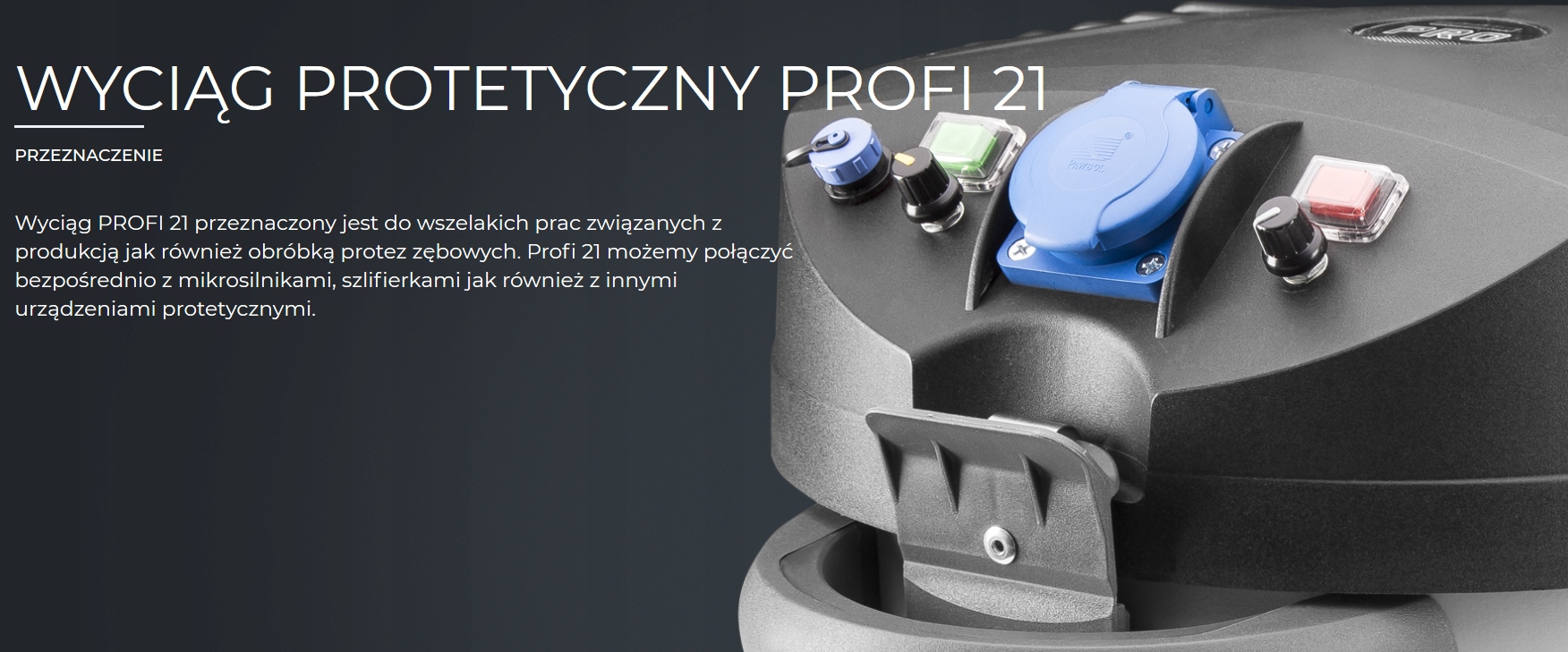 Екстрактор PROFI 21 призначений для всіх видів робіт, пов'язаних з виготовленням і обробкою зубних протезів. Profi 21 можна підключити безпосередньо до мікромоторів, шліфувальних машин та інших протезів.
