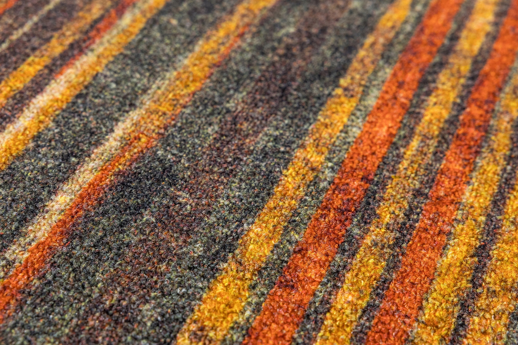 Протиковзаюча доріжка FUSION 14 з малюнком у вигляді неправильних горизонтальних смуг, які переплітаються між собою, створюючи динамічний та теплий візуальний ефект. Доріжка ідеально вписується в сучасний інтер'єр. Зношені кольори — відтінки сірого, що переплітаються з помаранчевим і жовтим. Контрастні колірні переходи та фактура тканини додають глибини та створюють практичний аксесуар, який легко чистити.