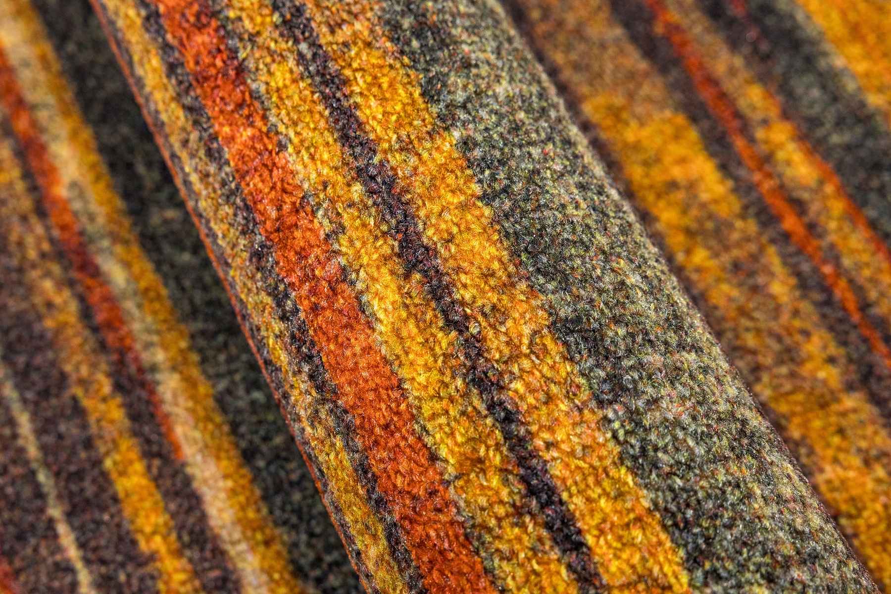 Протиковзкий килимок Fusion з поліамідного флісу з низькими петлями зі смугастим візерунком у відтінках сірого, помаранчевого з кремовими та жовтими вставками та прогумованим низом.