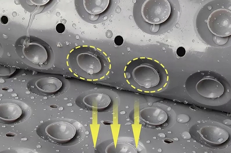 Килимок легко підтримувати в чистоті завдяки сотням дренажних отворів, які забезпечують швидкий дренаж води та швидке висихання після використання. Килимок також можна прати в пральній машині, що робить його легше чистити та обслуговувати. чистота.