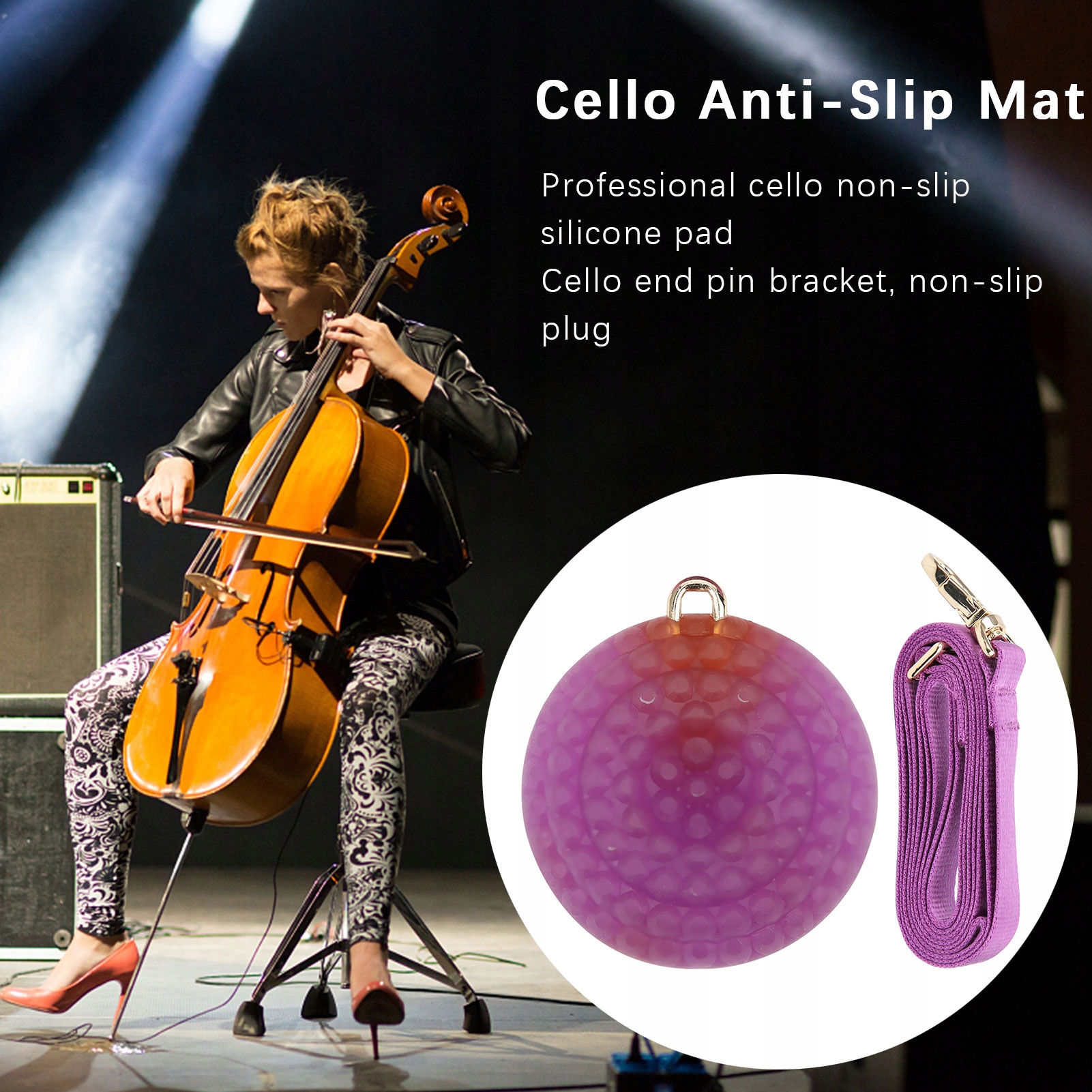 1, професійна протиковзаюча силіконова накладка для віолончелі, кінцевий кронштейн для віолончелі, протиковзка кришка. 2. Ремінець виготовлено з високоякісного нейлонового матеріалу, його довжину можна регулювати, а основа виготовлена з високоякісного силікону, який є міцним і довговічним, його нелегко пошкодити. 3、Щоб запобігти подряпинам на підлозі та забезпечити, щоб віолончель не ковзала під час занять або виконання. 4、Подовжте термін служби та подбайте про те, щоб ваша віолончель не зісковзувала під час занять або виконання. 5, легкий і зручний для транспортування, ви можете покласти його в сумку, ви можете використовувати його будь-коли та будь-де.