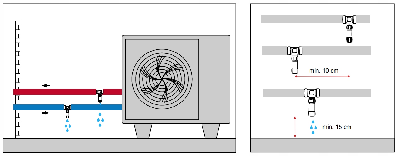Клапани проти замерзання серії QS завжди слід встановлювати парами: один на трубі подачі, а інший на зворотній трубі у зовнішній частині установки – у шаховому порядку, щоб конденсат із клапан, встановлений на верхній трубі, не тече на клапан, встановлений нижче. Установку слід проводити у вертикальному положенні, спусковим гачком вниз. Клапан, встановлений на водостічній трубі, не повинен і не може стикатися з землею чи фундаментом теплового насоса, дренаж має бути принаймні на одну довжину клапана (мінімум 15 см). p>